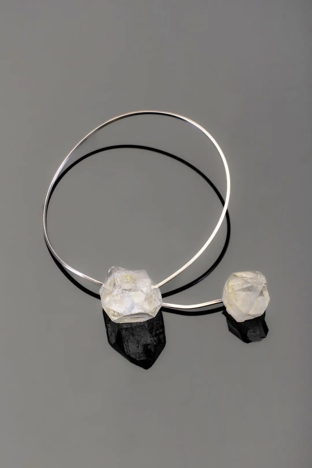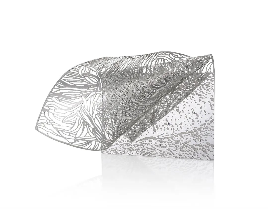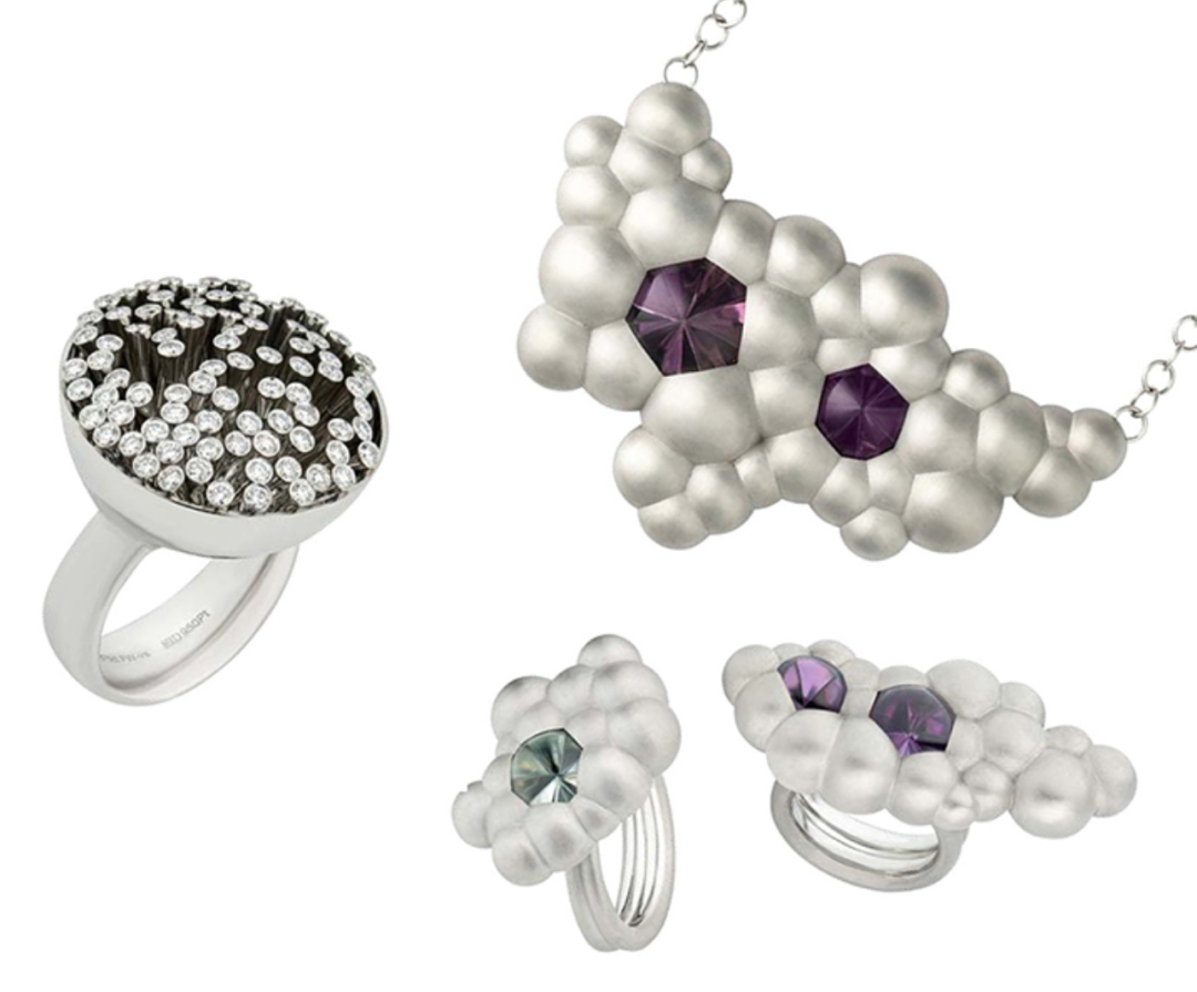 作為一位女性藝術家,小睦作品的氣質雅致中透露著灑脫,自帶幾分風骨。她常借作品描繪“山水”,善用各色石材,因此她的首飾自然的具備了些許東方氣韻。扎實的金工令她可以在游刃間將金屬的可塑性極至展現,然而創作時卻并不拘泥于依賴純手工制作。本次展出的20組首飾作品既貫穿為系列,又各自獨立存在。其中天然與人造材料依次出現,同時包含多種材質3D打印技術,傳統與數字造物方式并用。多年來首飾設計經驗的積累,使小睦能夠充分調動技術的可能性,使作品在松弛卻精準的狀態下產出。所謂“將任何技術都當作是手中的一把錘子”,在此得到豐富的詮釋。