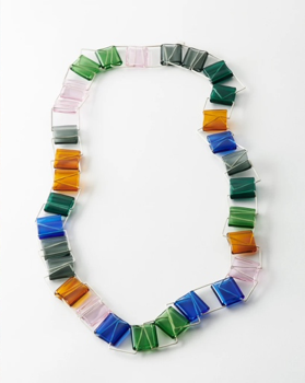 Marcus Scholz 在墨爾本街頭漫步時拍攝的一系列意外和故意的多重曝光膠片照片充滿了色彩和扭曲的建筑細節。這些獨特的照片讓 Blanche 走上了抽象和轉化的道路,這些獨特的照片被用作一套由彩色和透明硼硅酸鹽玻璃、陽極氧化鈦和銀組合制成的項鏈的起點。