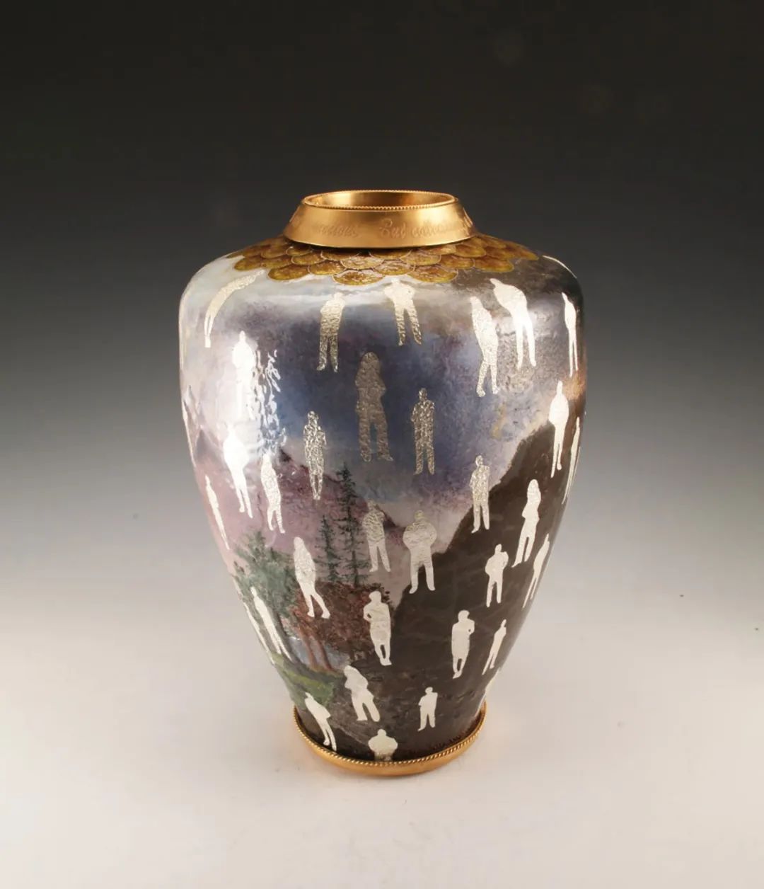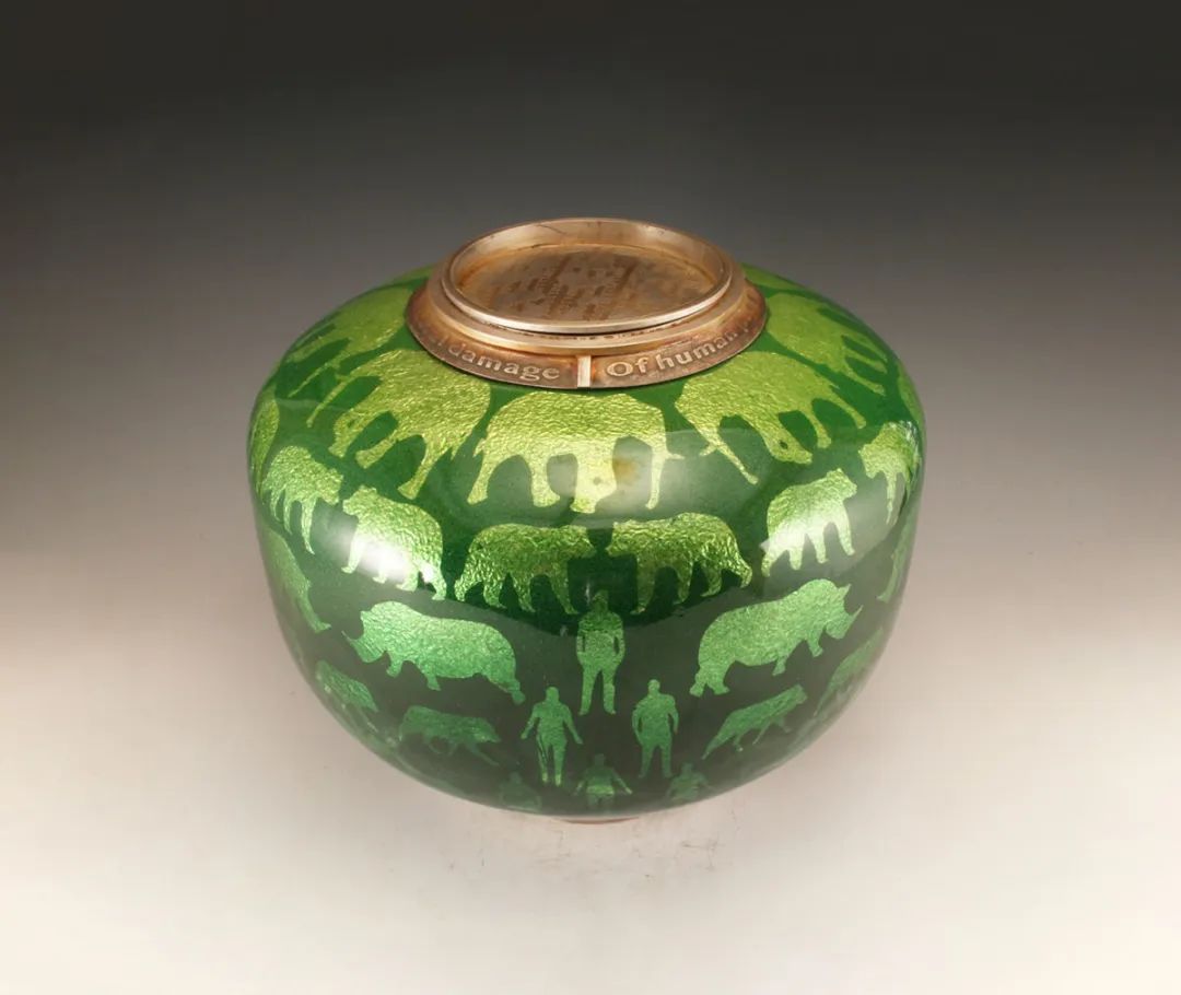 作為一名從事金屬和琺瑯創(chuàng)作并創(chuàng)作俳句詩的藝術(shù)家,我創(chuàng)作的器皿反映了主題、顏色、紋理以及自然世界的美麗、嚴肅和神秘。地球、它的植物和動物、地理和景觀,激勵我創(chuàng)作并嘗試傳達一些在荒野中的情感反應(yīng)。我的《滅絕船只》對人類造成的地球上野生動物的消失進行了評論。我的“環(huán)境容器”評論了我們?nèi)绾闻c地球互動。我也對我們在整個歷史中告訴自己的故事感興趣,試圖賦予我們的旅程意義。