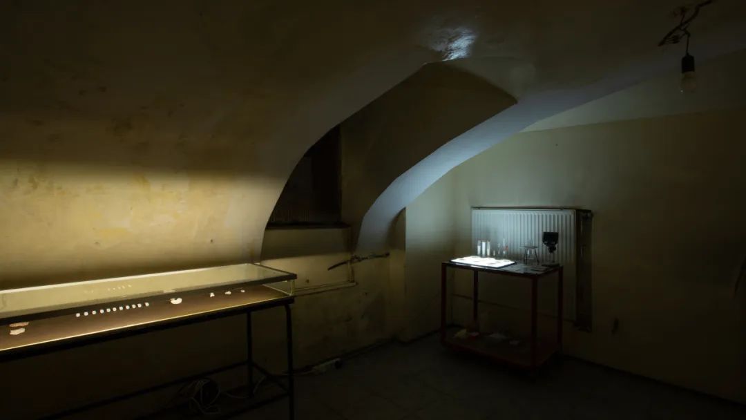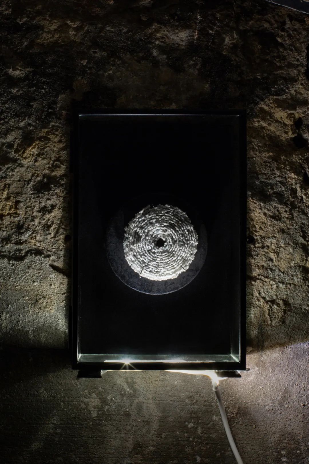 A:展覽布置花費了很多心思,因為我選的是地窖,給我提供了很大的展覽空間,但那只有一盞燈,十分昏暗。于是我決定干脆就全都暗下來,只照亮作品。一部分“考古碎片”陳列在玻璃桌里,也特意為一部分“保存完好的文物”制作了燈光展示盒,懸掛在墻上。引導(dǎo)觀眾的視線,也給整個空間營造了比較神秘的氛圍。
