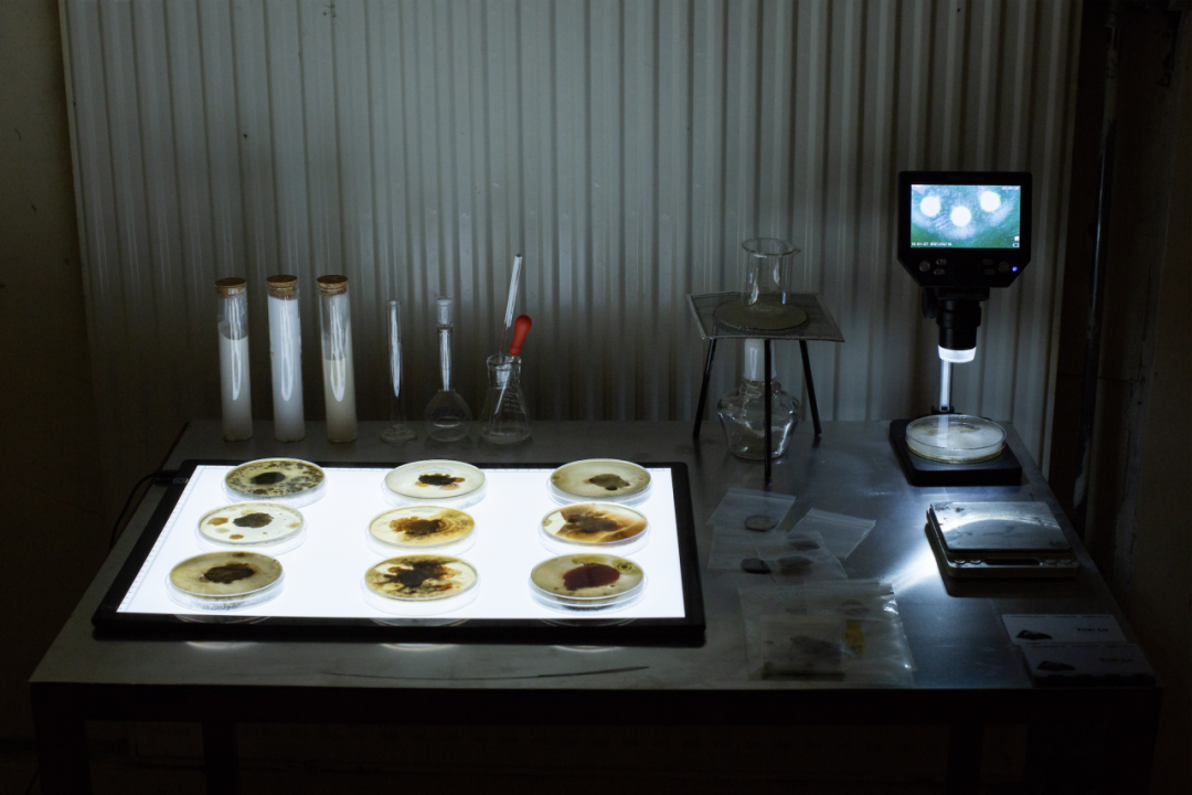 我在安特衛(wèi)普的一個地堡里虛構(gòu)建造了一間城市考古實驗室(建立于2430)邀請觀眾進入這個沉浸式空間來探索未來的考古發(fā)現(xiàn)和檔案。在這里展示的物品反映了21世紀(jì)城市生活的碎片。比如:建筑工地的磚塊,超級市場的收據(jù)單,房屋住宅的柵欄以及街道路面的口香糖,這些可識別的物體隨著時間的推移轉(zhuǎn)變?yōu)榫哂兄参铮瑒游锘蚴堑V物特征的生物形態(tài)。