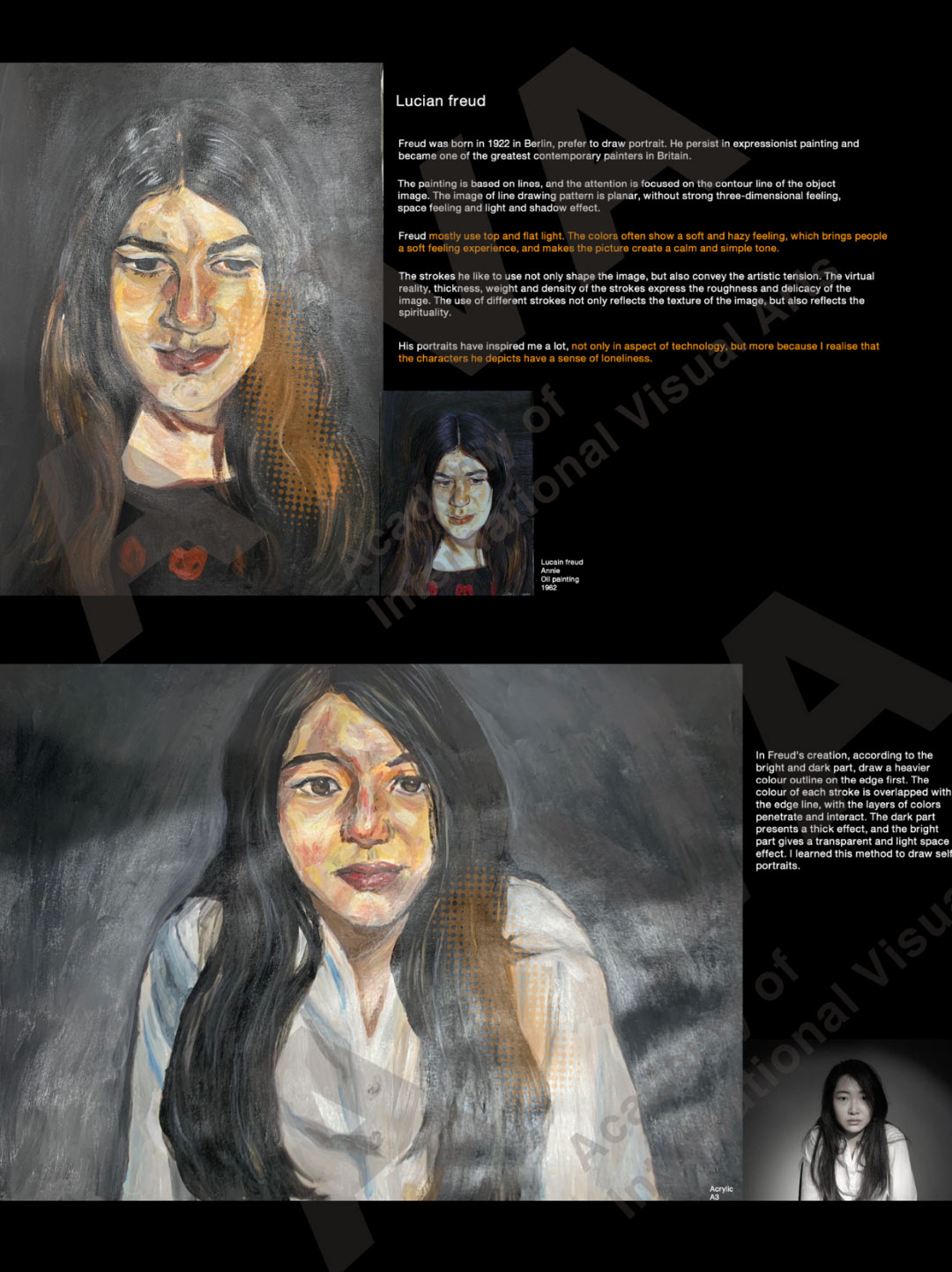 Wang同學的作品集中,除了有對自己作品的展示,更多的則是展示了自己的的創(chuàng)造思路、創(chuàng)作過程以及對作品的思考。在創(chuàng)作自己的插畫作品集時,Wang同學充分學習和借鑒了 Lucian freud 、Roxartss 、 Francis Bacon 、 Vince Low 等藝術家的創(chuàng)作風格,對各個藝術家的風格做了深入分析以及比較性研究,對比了他們在明暗光源,筆觸細節(jié)之類的異同。在汲取大師的繪畫技巧作為營養(yǎng)的基礎上,如何把握住自己的繪畫風格,并精準地表達情緒,也是Wang同學想要在作品集中主要表達的觀念。