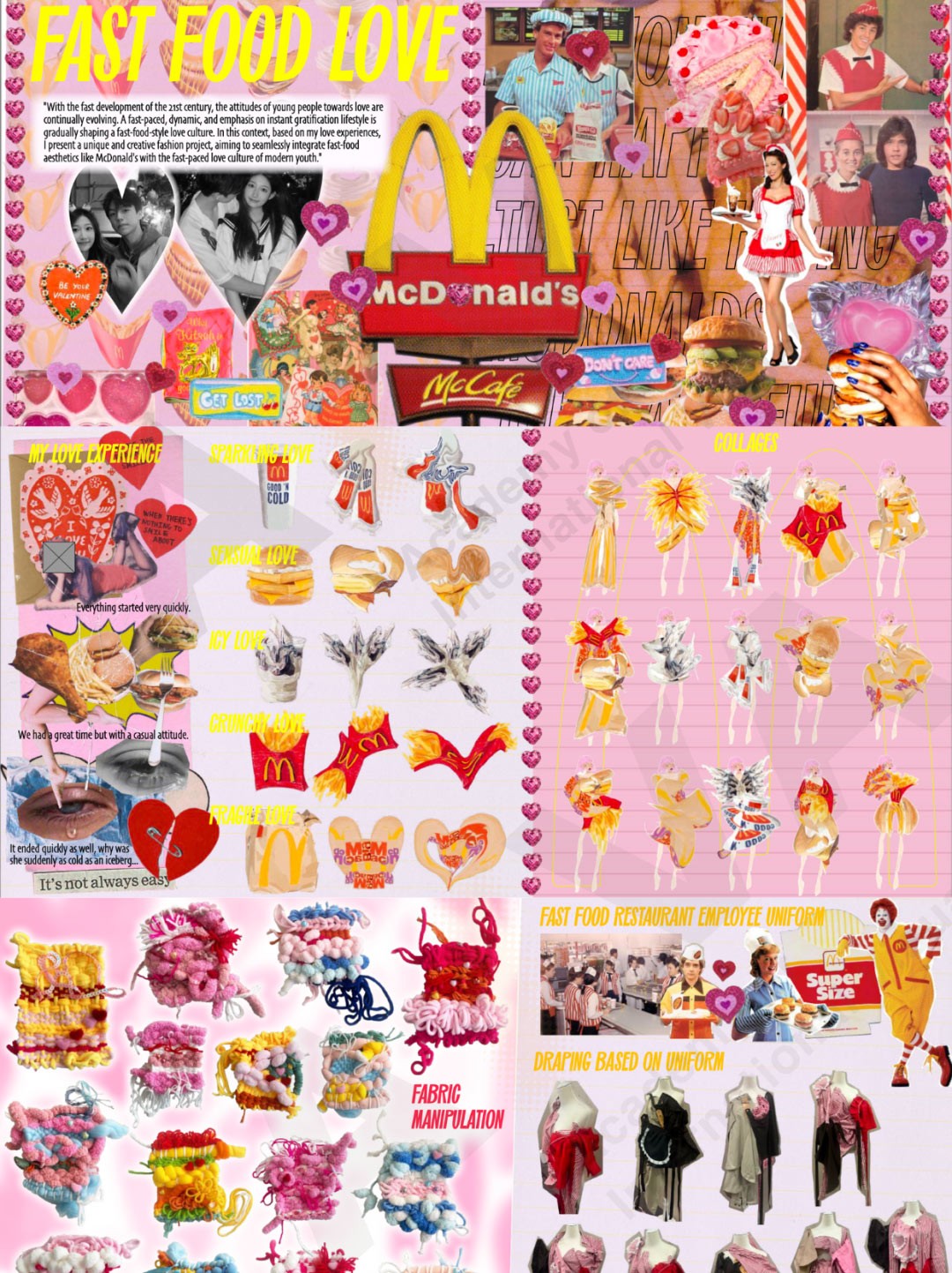 進入21世紀,年輕一代的戀愛觀念也發生了明顯的變化,一種快節奏的、充滿活力的、強調即時滿足的生活方式正在逐漸形成快餐式的愛情文化。在這樣的背景下,我基于自己的戀愛經歷,設計了一個獨特而富有創意的時尚項目,這個項目旨在將麥當勞等快餐美學與現代年輕人快節奏的愛情文化完美融合。