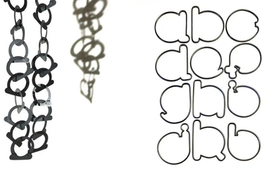 Roseanne 的最新作品將字母表視為一種觸覺系統(tǒng)。她測試了字體設計的解剖結構,以響應裝飾的具體條件。該項目將基于字體的探究擴展到珠寶領域,包括字母項鏈、耳環(huán)、手鐲和戒指。每件珠寶都為字形字符和佩戴者的身體之間的互動創(chuàng)造了機會。