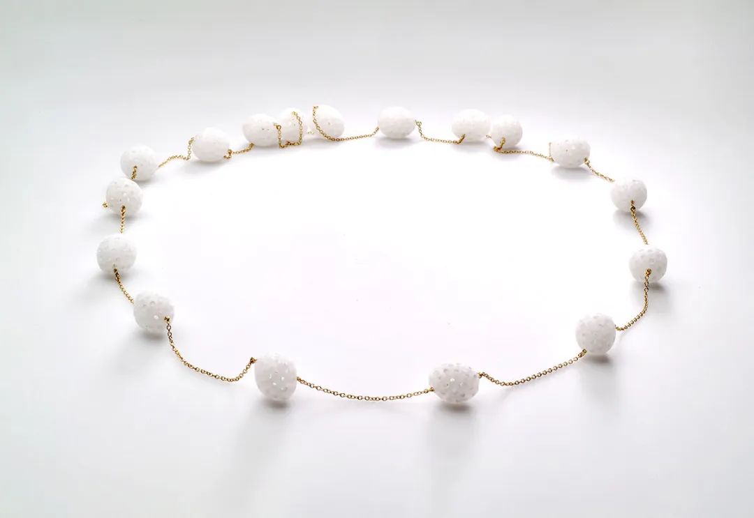 我使用了捐贈的材料,從耳環(huán)單件到破損的耳環(huán)、人造珍珠和未知材質的珠子、帶水鉆的人造珠寶、純銀和 14k 金不想要的物品。我創(chuàng)作的一些作品更為激進(例如 Drippy 項鏈),而有些則更為虔誠和傳統(tǒng)(Orphan 吊墜項鏈)。其中一件作品與我的鋼和金作品有關(甜美的金色 Paperchain Cluster 耳釘),但大多數作品的靈感都來自我手頭材料中看到的東西。我借鑒了我的銀匠培訓(Salamander 項鏈)、我的設計教育(使用不同的材料),并學習了一種新的打結技術。感覺就像一個充滿不斷探索和實驗的駐地,我將把這些探索和實驗帶到未來的新作品中。