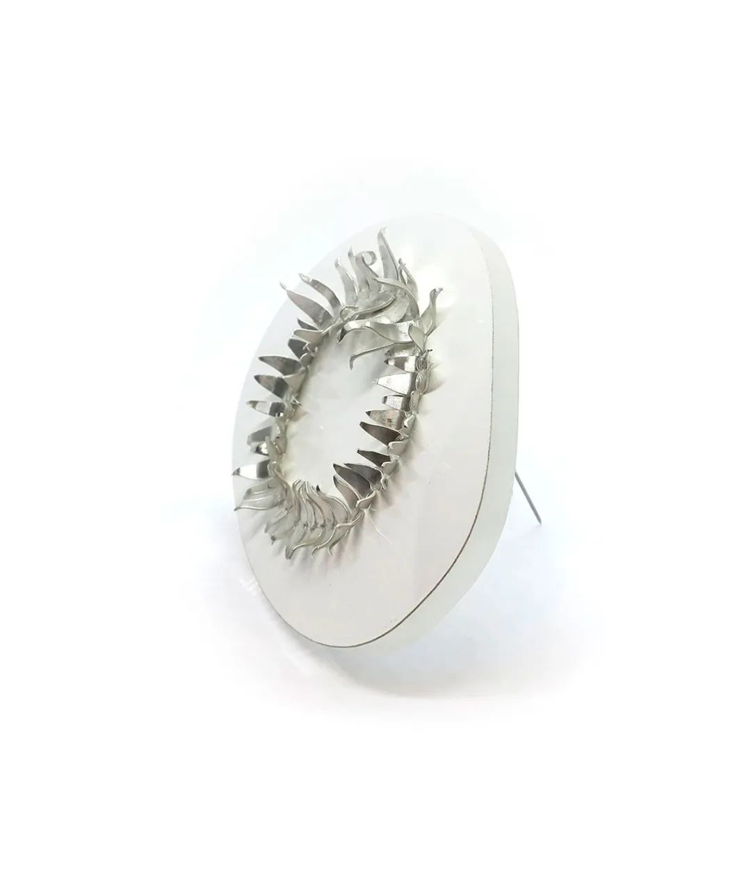 對于Hee-ang來說,蘑菇絕不僅僅是餐桌上的食物。在一次散步中,她偶然發現一株野生蘑菇,被它獨有的美所觸動,這使她有機會去深入研究這一特別的生物。最初,她嘗試用作品去還原一株完整蘑菇的構造,以展示其本身的復雜細節。然而隨著時間的推移,她發現從蘑菇的萌芽到腐爛的整個生長過程,都給她帶來了極大的啟發。Cluster系列以蘑菇“鰓”為主要設計元素,想象了蘑菇群是由廣泛分布的地下菌絲體形成的。另一方面,Inside Out系列設想將蘑菇帽翻過來,露出“鰓”,在內部和外部紋理之間形成節奏對比。Bloom and Wither捕捉了蘑菇生命周期的各個階段,而Slowly則描繪了蘑菇逐漸展開的過程。