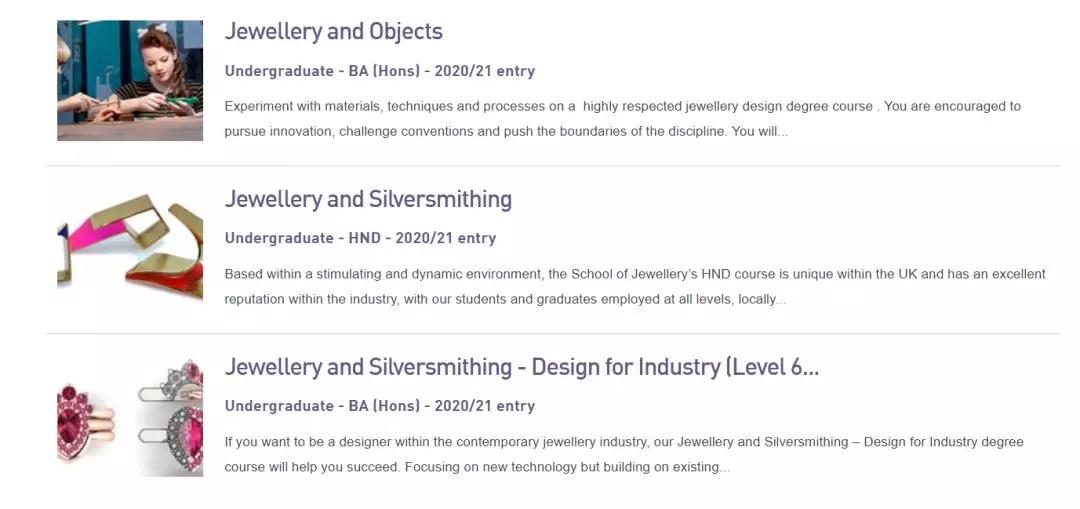 那究竟是怎樣的課程設(shè)置的優(yōu)勢,使得伯明翰珠寶學(xué)院獲得這樣高的學(xué)術(shù)地位呢?我們先來看一下他的專業(yè)設(shè)置: