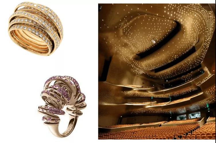 de Grisogono Allegra的戒指。圖右為廣州大劇院內部。