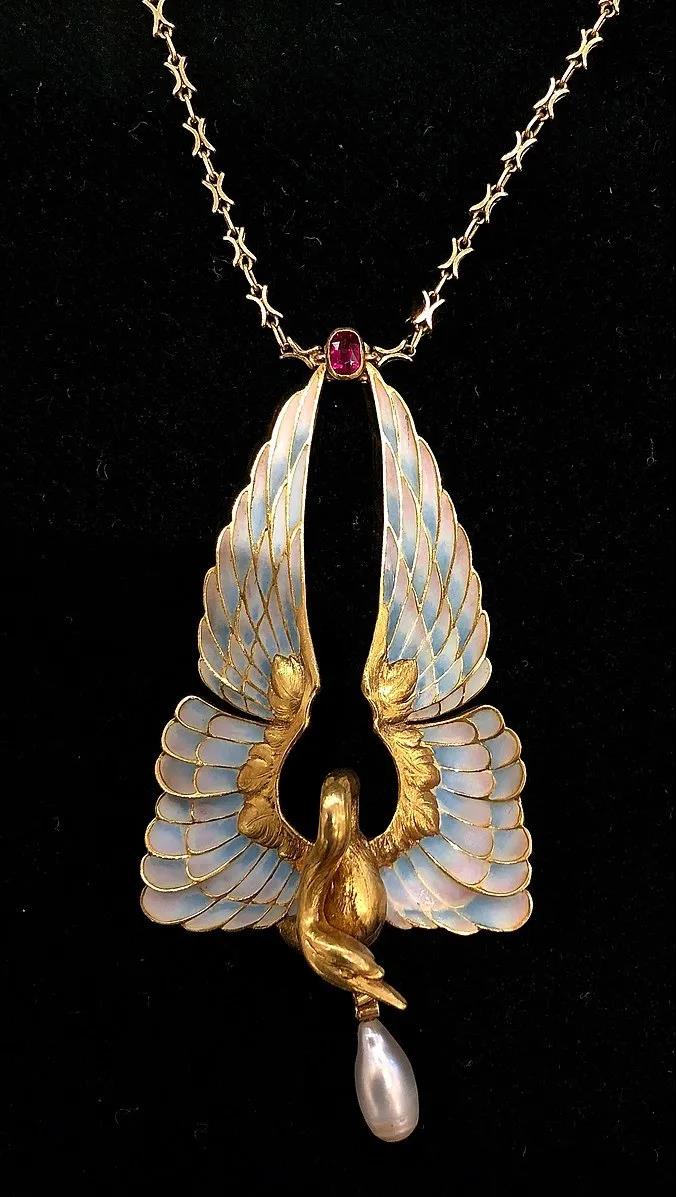 首飾是新藝術運動的一大門類。此時期部分作品是對于日益大規(guī)模制造的珠寶的回應,醒目的美學風格與自由靈動的形式,靈感來自自然世界、創(chuàng)新材料和全新的設計原則。它以來自外部的新形式,包括英國的工藝美術運動和日本的藝術,重振了已成為公式化的自然主義。