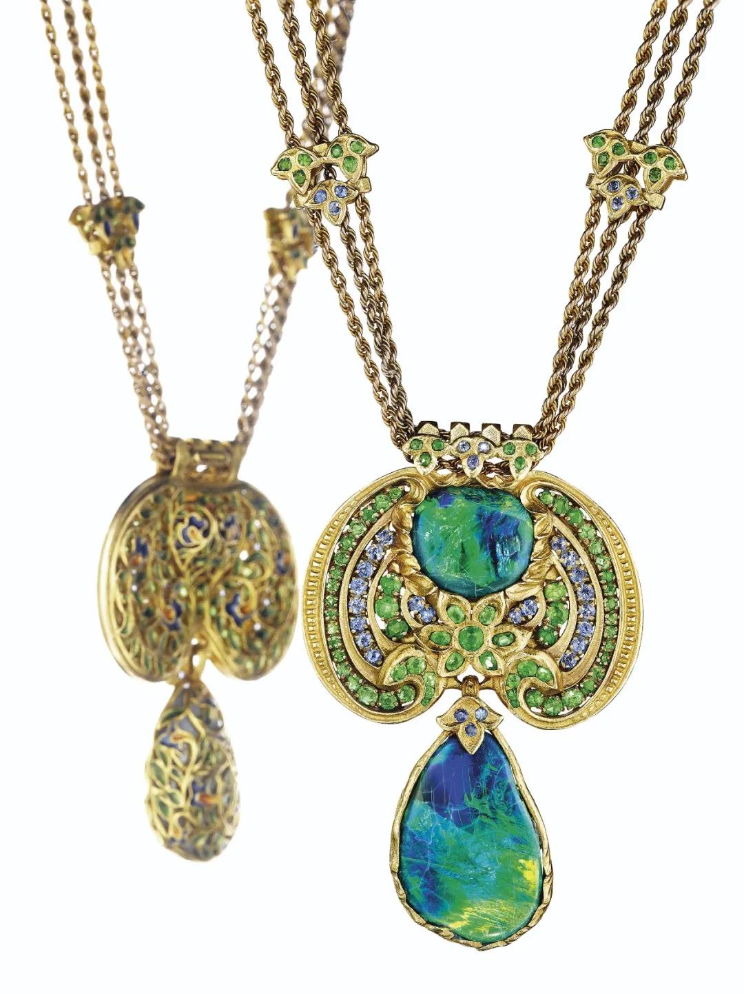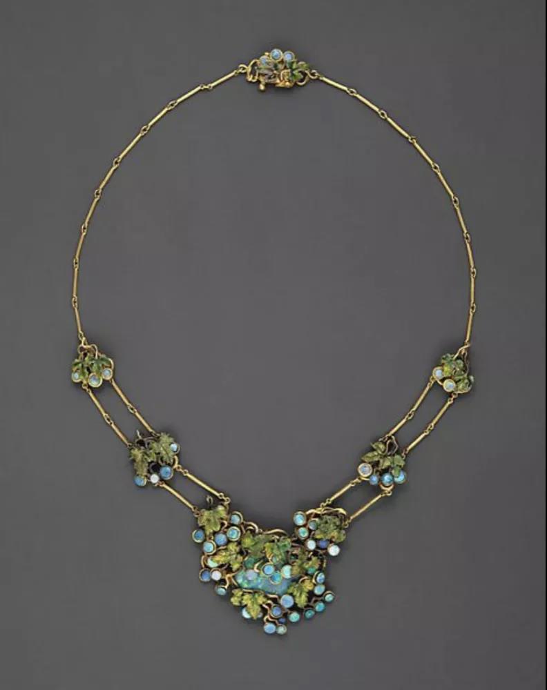 下面這條項鏈由葡萄簇和樹葉組成,是Louis Comfort Tiffany設計最早設計的珠寶之一。微小的黑歐珀代表水果的簇類,在金色的綠色陰影下精心地做裝飾,形成細膩的葉子。蛋白石呼應了Tiffany的璀璨光芒,讓人想起他在法夫里爾玻璃的花瓶。其設計及有機形狀的不對稱性完全符合他對自然形態(tài)的熱情。