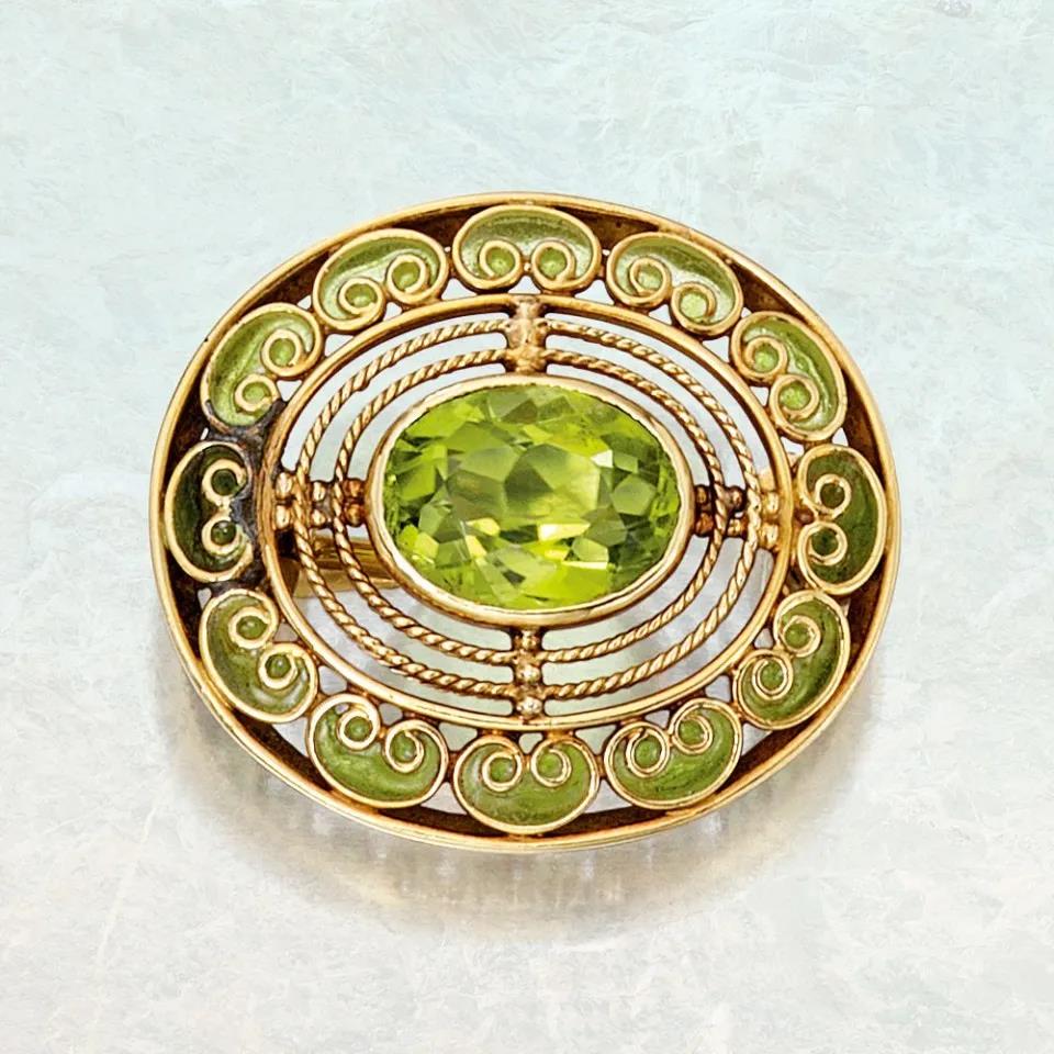 下圖這只胸針使用了黃金、橄欖石以及透光琺瑯。流暢工整的幾何構圖,已經(jīng)能看出Art Deco的端倪。