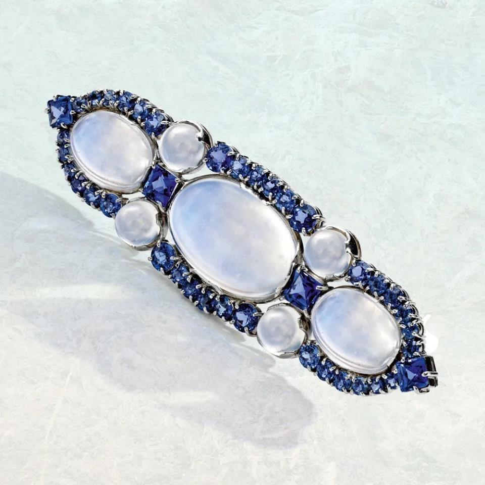 下圖這只胸針則以玉石為中心,將之與白金及藍寶石搭配,甚至直接以中式玉雕的方式處理玉石,相信在當時的紐約名流貴婦眼中十分富有異國情調。