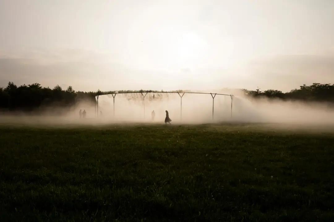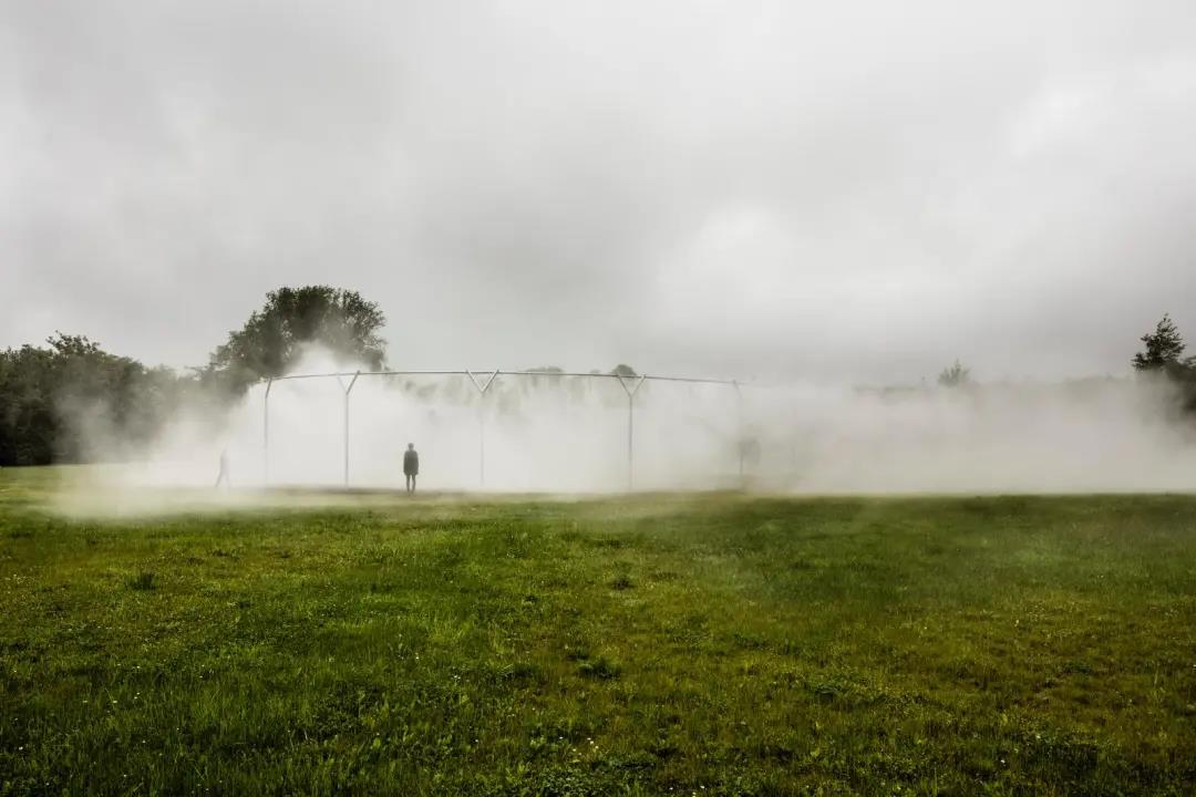Olafur Eliasson 在室外作品《Fog Assembly》中,利用光與風的質(zhì)量控制煙霧的產(chǎn)生,模糊了裝置的邊界,制造出空間的瞬時與變化感。