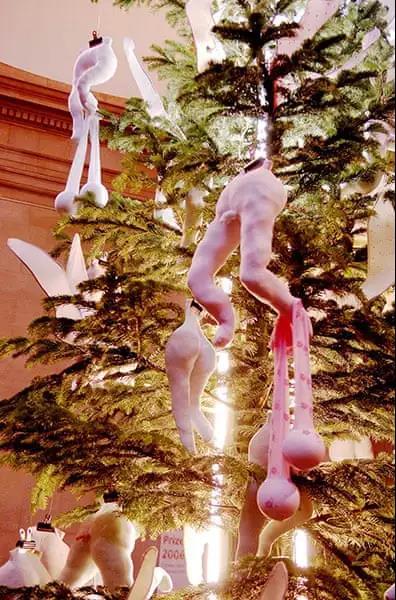 英國藝術家Sarah Lucas設計的圣誕樹浪漫又野蠻,樹枝上掛的是用粉色長襪做成的“殘肢”。