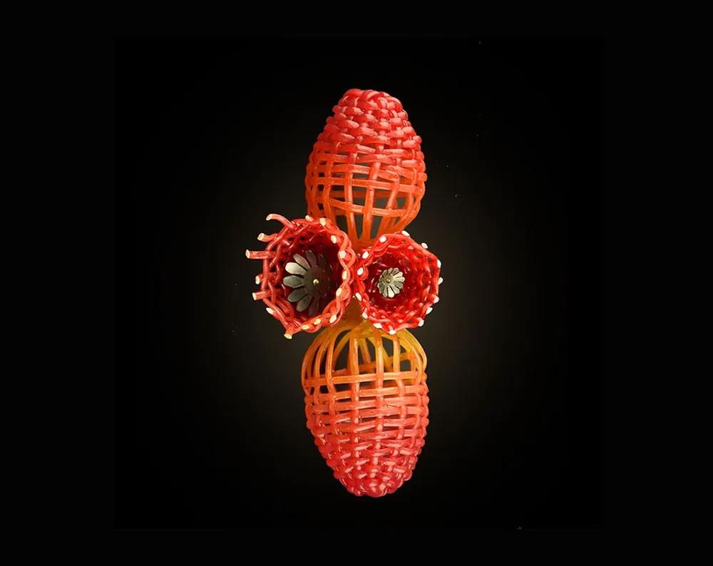 但Wang設法提升整個女性世界的品質,她贊美女人的各種形態。作為一名首飾藝術家,她嘗試了意大利面的彈性,以及將意大利面煮熟并交織在一起的可能性。組合的結構很牢固,不易斷裂。沒錯,Qian選擇了意大利面并煮了它,但卻將其轉換成耀眼的首飾,這否定了意大利面的可食用性,將它們呈現為多彩而優雅的首飾。