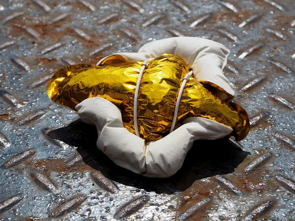 在創(chuàng)作《驚喜元素》系列時,畢業(yè)于謝菲爾德哈勒姆的首飾藝術家Anderi Jakab運用了大量的仿金銀箔紙元素作為禮物包裝紙和驚喜的象征。