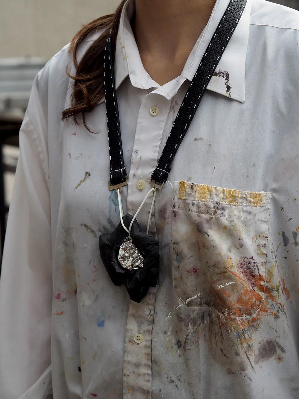 驚喜是驅使我制作這個系列的原因,我找到一種方式來包裹和佩戴這些物體。我的系列“驚喜元素”代表了一組被策劃的神秘,作為象征自制力的護身符。”