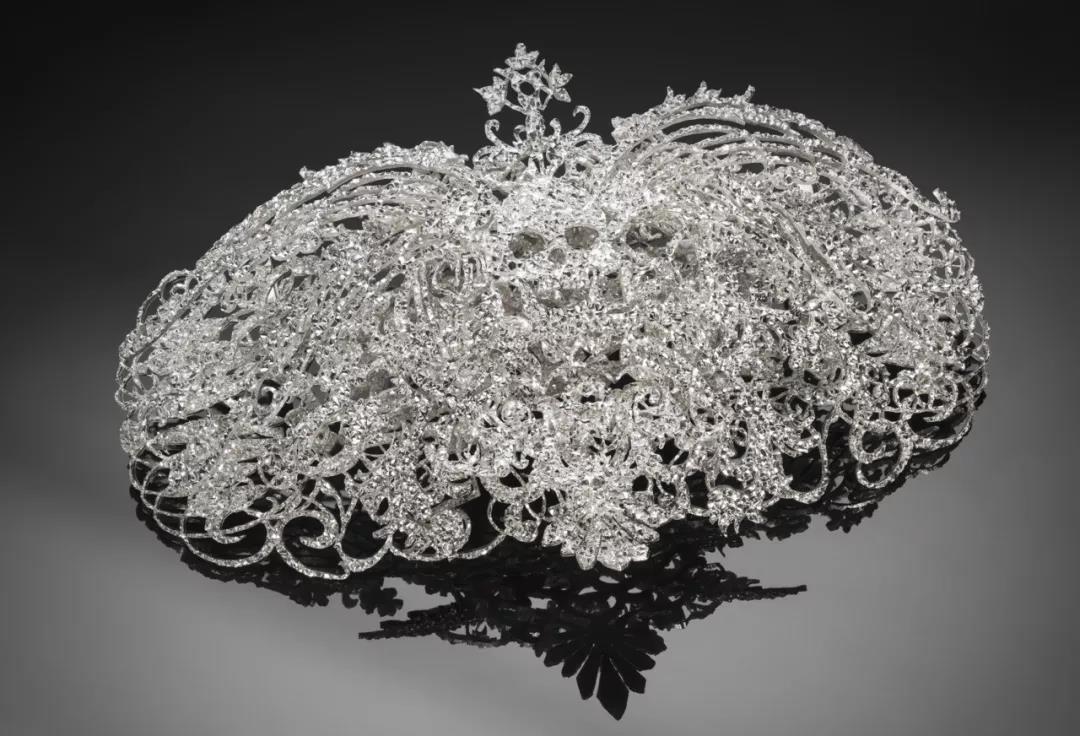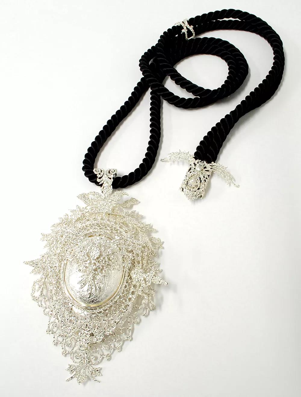 “田口史樹通過對主題和材質的巧妙處理,重新詮釋了胸針和吊墜。他的首飾似乎被精美的寶石所迷惑,通過不同的切割和角度折射出線條,藝術家通過將純銀雕鑿成一種模擬鉆石等寶石的光澤來達到這種效果。田口對銀的使用指向首飾價值的建構,暗示銀與貴重的巖石一樣光芒四射。田口曾說:“在不鑲嵌任何寶石的情況下,我常常使用制作寶石的結構來呈現金屬本身的力量和精致感。”胸針和吊墜類似于家族徽章或盾徽;通過破壞物質象征和清空徽章的肖像,胸針成為超越舊血統的新型關系的容器。”
