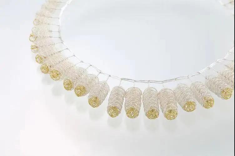 誠然,這種帶有民族風格的美學追求體現在對作品篩選的不言而喻的標準中,但這確是嚴格建立在凌駕工藝的高標準之上,并非某個懸置的概念。這從大賽最具榮耀的特等獎(Grand Prize) 獲得者安藤康弘(Ando Yasuhiro)的作品中可見一斑。這件項鏈的制作手法與最古老的金銀器工藝“掐絲法”相關聯。此為一種極為精細的做法:通常需要將錘揲成極薄的金銀片剪成細條,慢慢扭搓成絲,或者通過堅硬的撥絲板上的錐形細孔將金銀擠壓而入,從另一面的小孔中將絲抽出,再將金銀絲編織成器物或者紋飾。其中又以制作立體的掐絲作品為最高難度。類似工藝還有“錯金銀”(器物表面鑲嵌金絲銀絲)以及由此而演變的“掐絲鑲嵌”(細金工藝)。安藤康弘的作品代表了日本當下首飾界中傳承技藝的水準。
