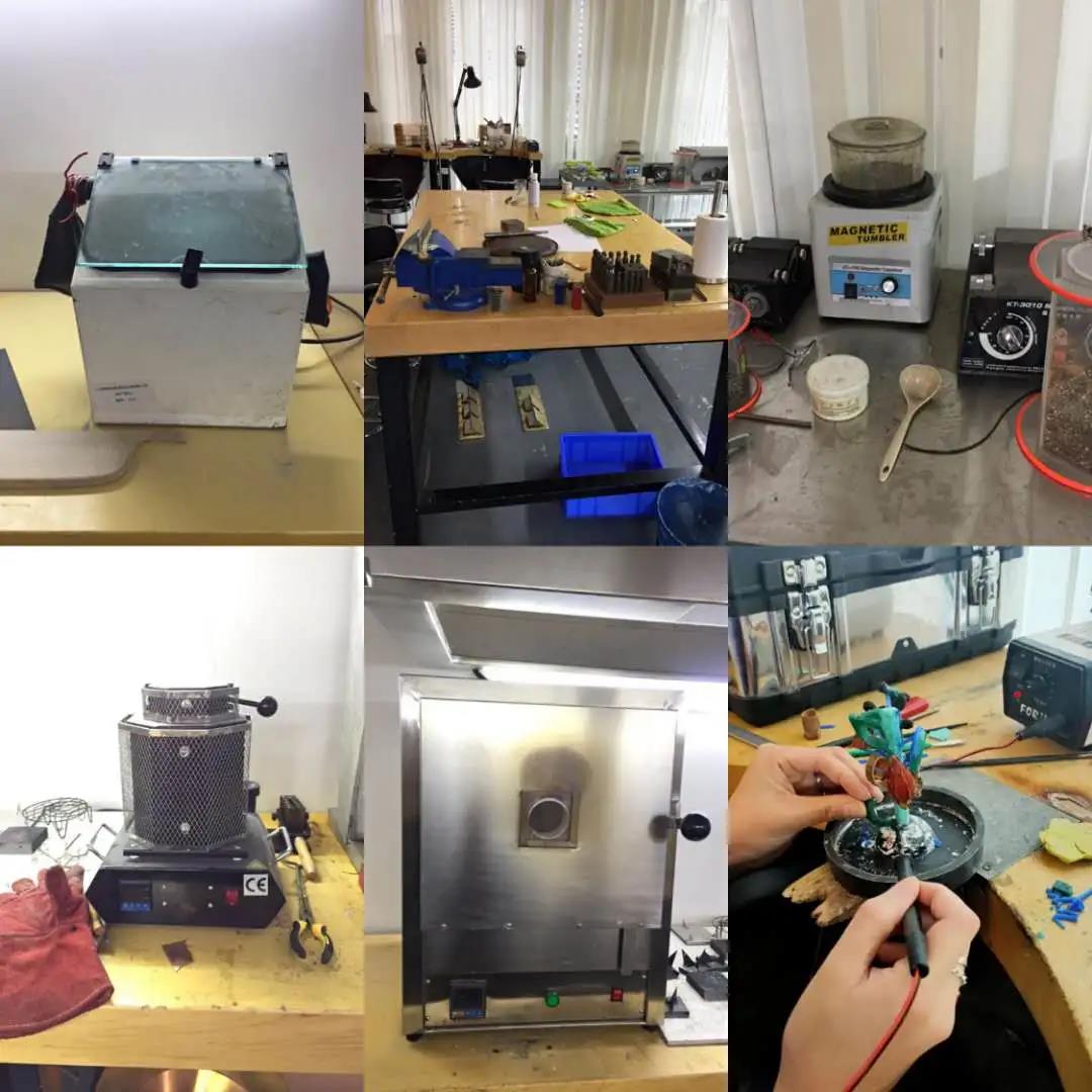 壓片機 Rolling Mill • 超聲波清洗機 Ulrasonic Cleaner • 熔焊機 Soldering Machine • 電焊機 Point-Welding Machine • 酸洗鍋 Pickle Tank • 棉綸拋光機 Polishing Motor • 磁針拋光機 Magnetic Tumbler • 滾動拋光機 Single Barrel Tumble • 鉆臺 Drilling Machine • 噴砂機 Mini Sand Blaster Machine • 大小琺瑯爐 Large and Small Kilns • 熔金爐 Metal Melting Furnace • 抽真空鑄造機 Vaccume Casting Machine • 油壓機 Hydraulic Press • 大桌剪 Bench Cutter • 平拋機 Lapping/Polishing Machine • 小型砂帶/沙盤機 Mini Sand-Belt Machine
