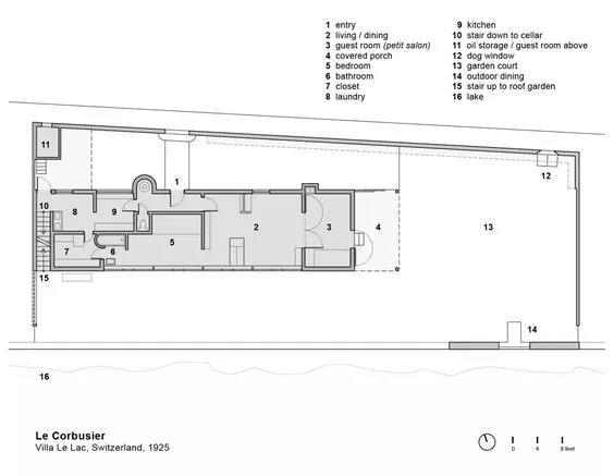 因?yàn)槭墙o年邁的父母建造的,因此柯布西耶并沒(méi)有追求過(guò)大的空間,而更著重于舒適、寧?kù)o和自然的環(huán)境。這個(gè)獨(dú)棟住宅座向基本正南正北,起居室里擺放著母親心愛(ài)的鋼琴和可以調(diào)節(jié)長(zhǎng)度的餐桌。屋頂花園與地面的庭院、遠(yuǎn)處的湖光山色相互呼應(yīng),提供了多層次的景觀體驗(yàn)。(屋頂花園后來(lái)也成為了柯布西耶重要的設(shè)計(jì)要素之一。)
