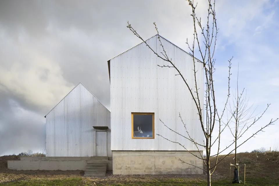 "House for mother" 整棟房屋分為兩個(gè)長(zhǎng)方形區(qū)塊,以不對(duì)稱造型構(gòu)造出350平米的狹長(zhǎng)空間。房屋外墻包覆著一層波紋鋁板,使得房子隨著日光照射的變化,呈現(xiàn)出有趣的光影效果。