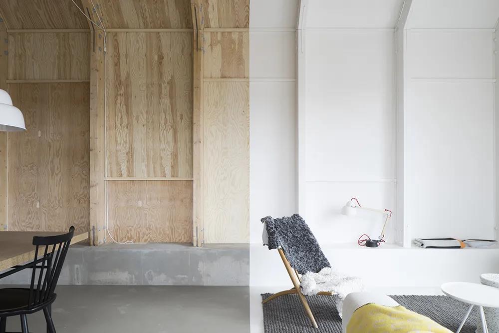 房屋內(nèi)的木梁與桁架采用了膠合板,為室內(nèi)帶來(lái)溫馨的氛圍。混凝土地板堅(jiān)固耐用而又不失美觀,非常適合日常使用,并且在建筑四周都有所翻邊,形成一圈包圍建筑的低矮長(zhǎng)椅。