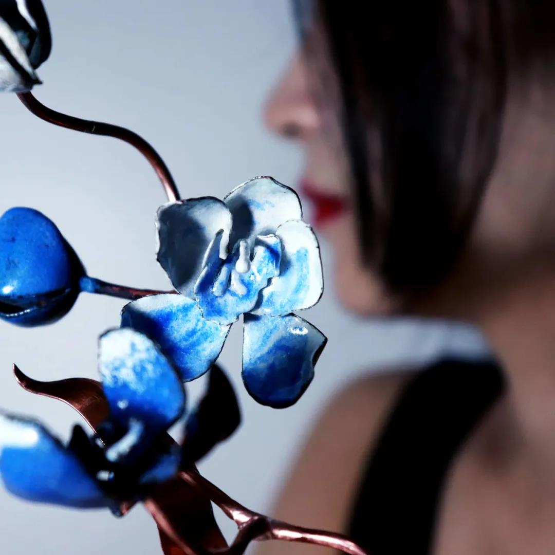 其次因?yàn)樽髌繁容^大,而學(xué)校的琺瑯爐比較小,每次只能單獨(dú)燒制一朵蘭花,所以將蘭花連接到主枝干上是一個(gè)很大的問題。我先后嘗試了鉚接和激光焊接,但它們都不能完好無(wú)損地連接在一起。我詢問了很多人的意見,并做了很多嘗試,最終找到了解決辦法。雖然過(guò)程十分艱辛,但是結(jié)果是好的。