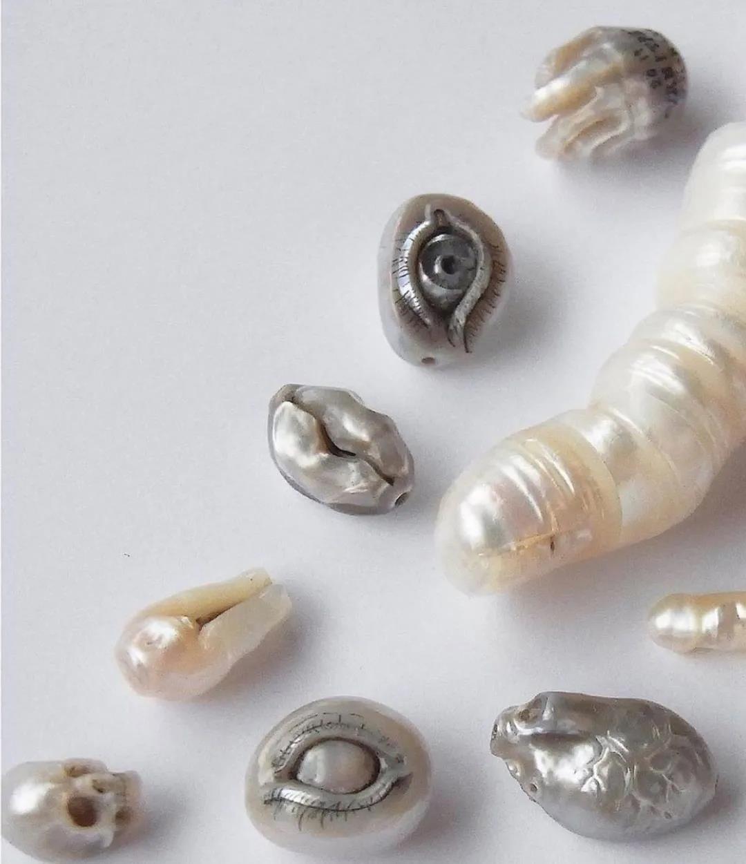Shinji Nakaba 是一位當代日本首飾人,他用礦物、貝殼、珍珠和鋼鐵以及回收的鋁罐和塑料瓶呈現自然主義但隱晦的圖像。Nakaba使用古老的工藝雕刻寶石、貝殼和珍珠。但是他的項鏈、胸針和戒指看起來一點也不傳統,盡管逼真的圖像被渲染得非常精確。面部以陡峭的角度出現,與其他面孔或人物緊張地接觸;單獨的女性乳房或男性生殖器位于前面和中央;珍珠變成了令人毛骨悚然的頭骨或無形的頭顱。