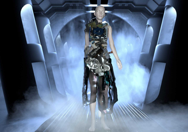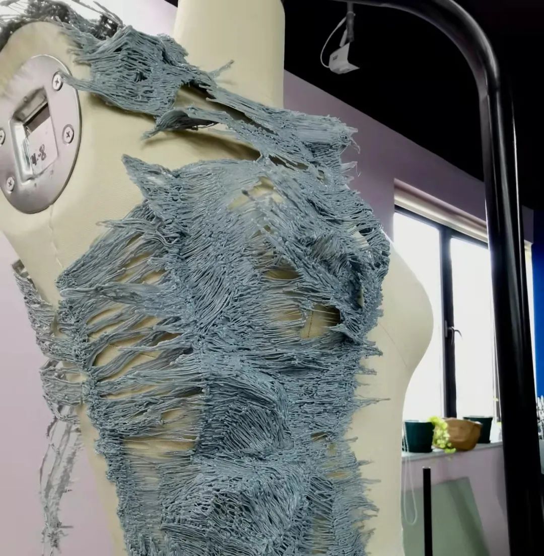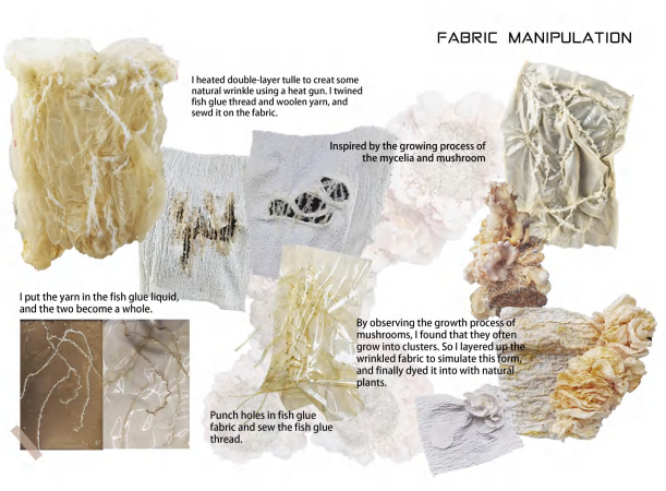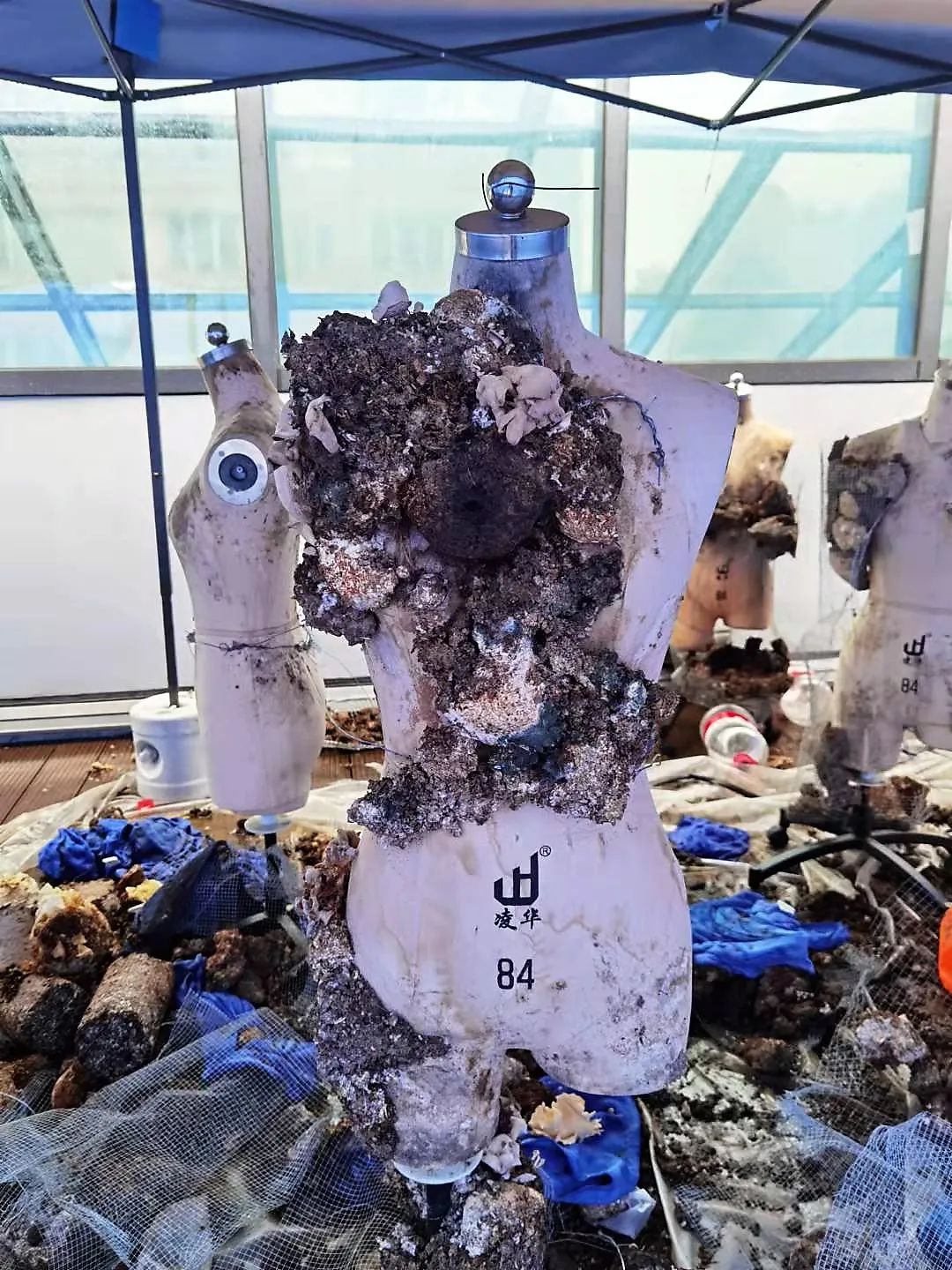 在種植蘑菇雕塑的實驗中,我發現了生命與身體之間的新的聯結性。我想將這種狀態和服裝、身體進行聯系,于是我嘗試將蘑菇培養轉移到人臺上,從蘑菇菌絲生長不斷和身體融合這個方向制作了我的服裝項目。