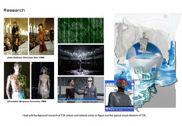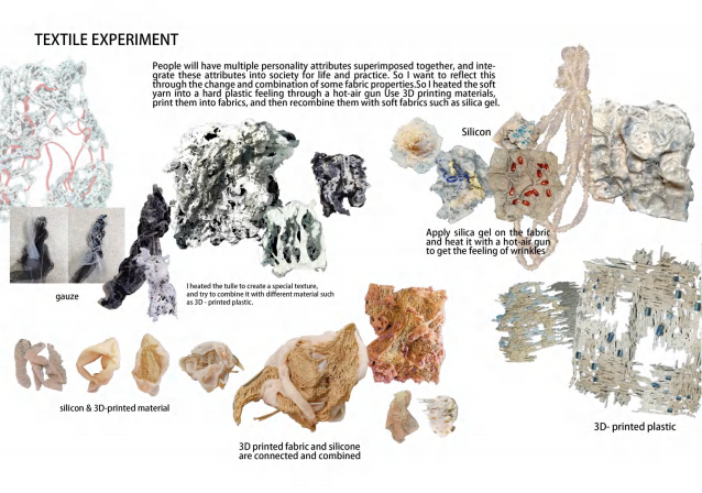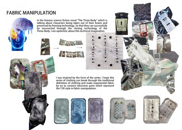 所以我們首先花了很多時間梳理她的靈感概念邏輯,刪掉了幾乎一半不相關和不夠好的內容。在明確了核心概念的基礎上再一步步思考如何轉化為服裝語言。我一直和我的學生們強調創作邏輯的重要性,你做的每一步必須要和你的概念有所聯系,并要能幫助你進行下一步的設計,不要單純為了讓你的作品集看起來很酷炫做一些形式主義的東西。