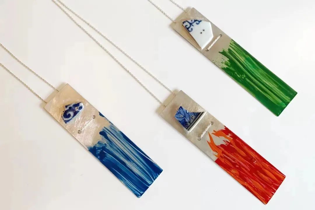 在上面這件作品中,Deganit Stern Schocken把粉彩瓷片與時針結(jié)合起來,意圖表現(xiàn)舊瓷片的歷史感和時間感。她的這兩件吊墜作品表明了一種無所顧忌的混搭的可能性,具有強烈的脂粉氣和女性意味。她把本應(yīng)被丟棄的破碎之物置入了一種全新的語境中,在這個新的語境里,碎瓷片既可以被看作為一個容器的基座,又可以變?yōu)橐患c身體親密接觸的首飾。