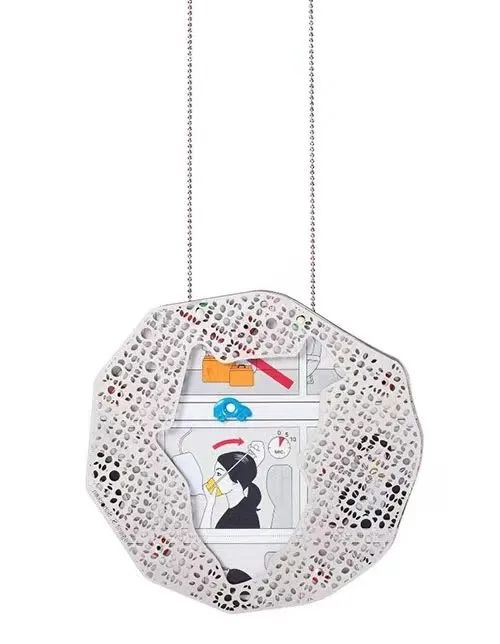 在2013年的個展In The Air中,Deganit 把重點聚焦在物體和空間的關(guān)系而不是物體本身。上圖作品中,鑲嵌在胸針與吊墜之間的石頭好像“在空中”。其中一些吊墜是從飛機安全說明中剪下來的,也非常符合展覽的主題。