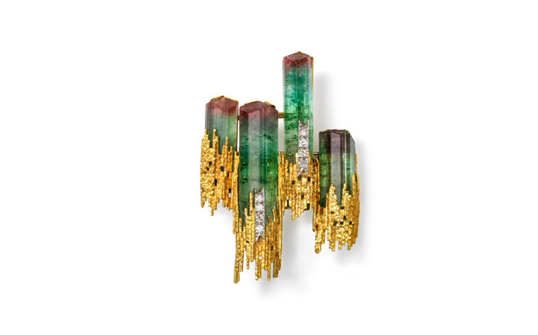 本次參展的創(chuàng)作者們認(rèn)為自己首先是一個(gè)藝術(shù)家,其次才是首飾人。他們將自己的作品視為一種現(xiàn)代藝術(shù)形式。這些藝術(shù)家主要使用黃金,并結(jié)合寶石與半寶石,以大自然為靈感,專注于有機(jī)形式,偏愛與太空時(shí)代趨勢(shì)相關(guān)的抽象形狀和概念。他們使用非常規(guī)材料,如珊瑚、貝殼、晶洞和隕石,它們?yōu)槭罪棊淼臒o與倫比的肌理。在一個(gè)以“不同”為美的年代,他們的風(fēng)格受到那些尋找獨(dú)特性的人們的欣賞。