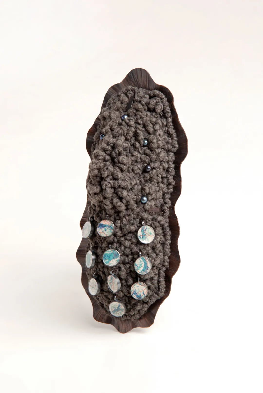 Repurposed shearling earmuff, repurposed vintage coral beads, fabric, polyester batting, wood, oxidized silver, copper, thread