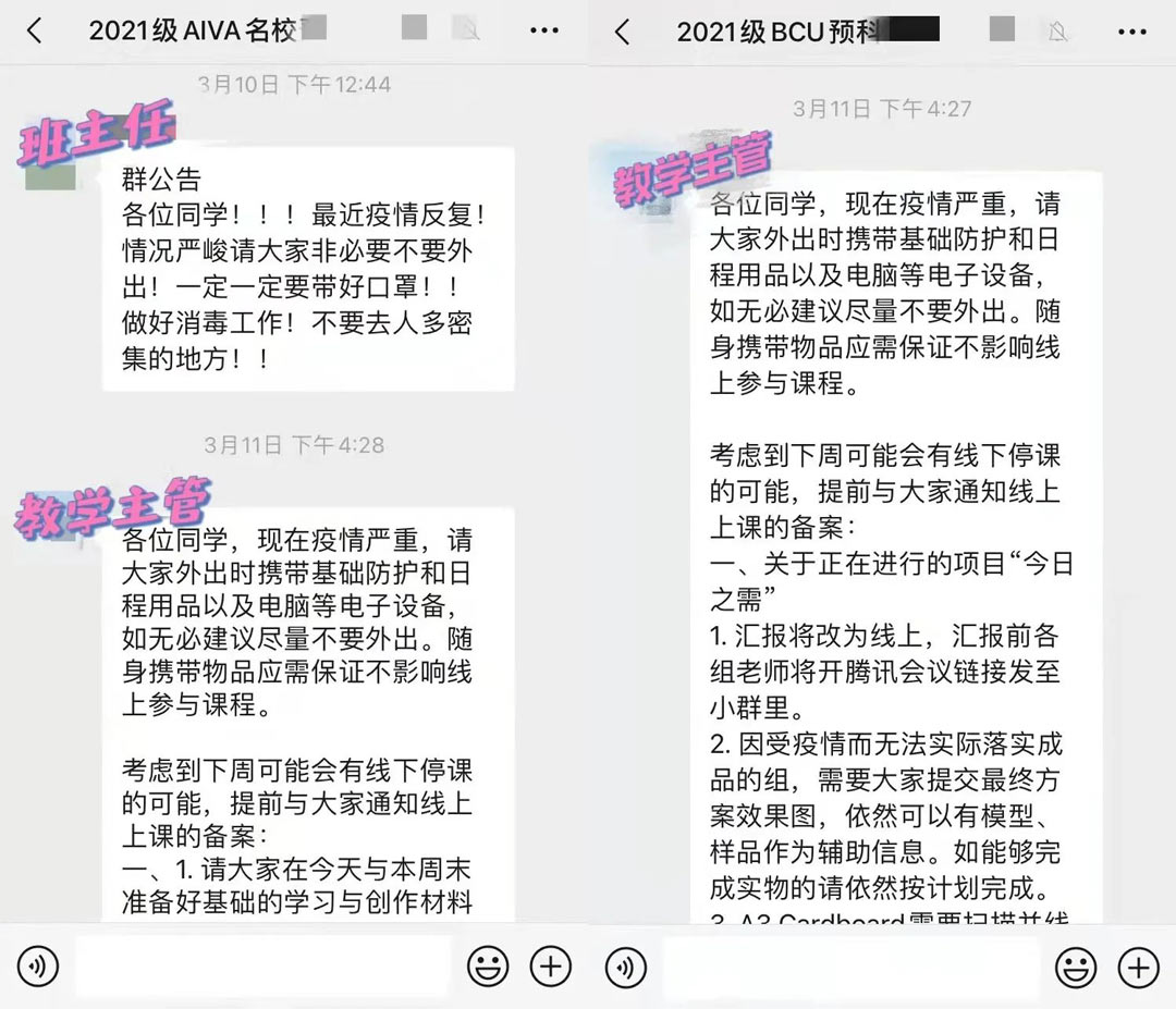 ▲ 教學主管老師與班主任第一時間在群里通知同學們做好防疫準備,并與學生家長保持溝通。