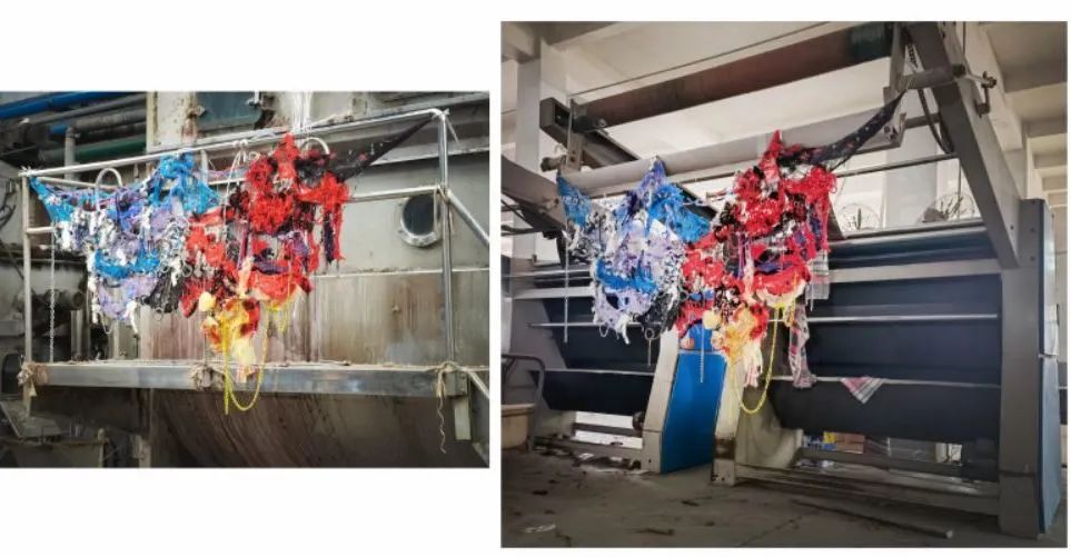 我用塑料材質(塑料管、泡泡紙)、金素材質和網狀材料來代表污染物,給他們染色,用一些毛線、碎布、紗線、毛氈來表現植物的質感,將這兩種反差很大的材質通過編織、縫線等等的方式結合到一起,來體現我的主題,污染和自然環境互相滲透。