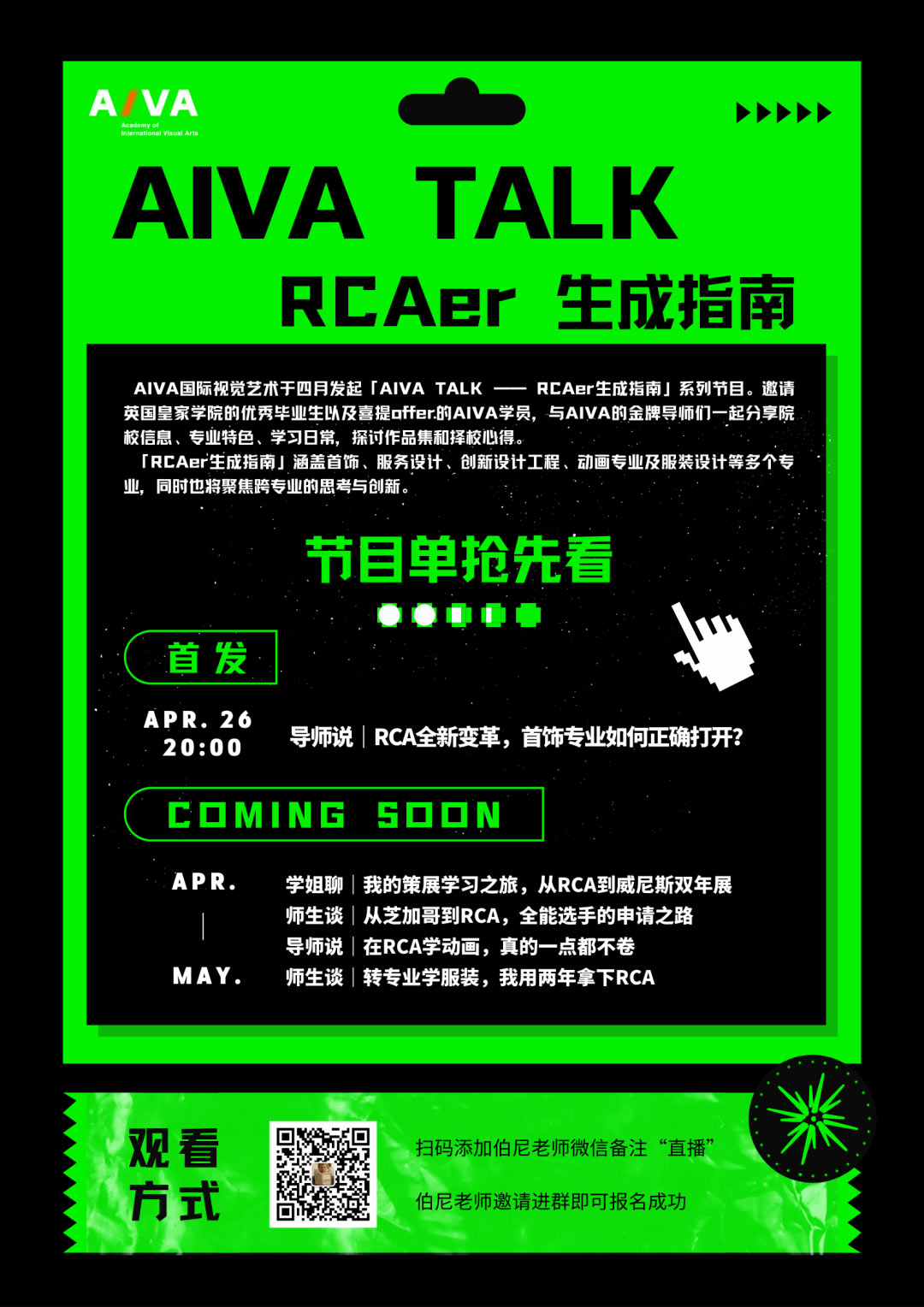 AIVA國際視覺藝術將從4月26日開始,為大家帶來持續一周的“AIVA TALK——RCAer生成指南”系列節目。邀請英國皇家藝術學院的優秀畢業生以及喜提2022 RCA Offer的AIVA學員,與AIVA的金牌導師們一起分享院校信息、專業特色、學習日常,探討作品集和擇校心得。