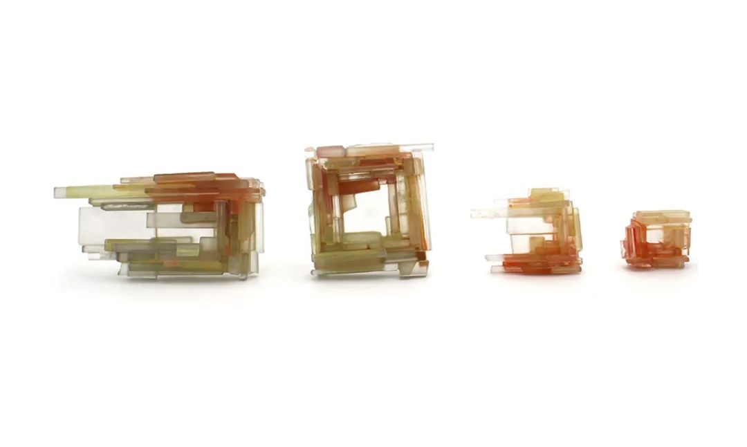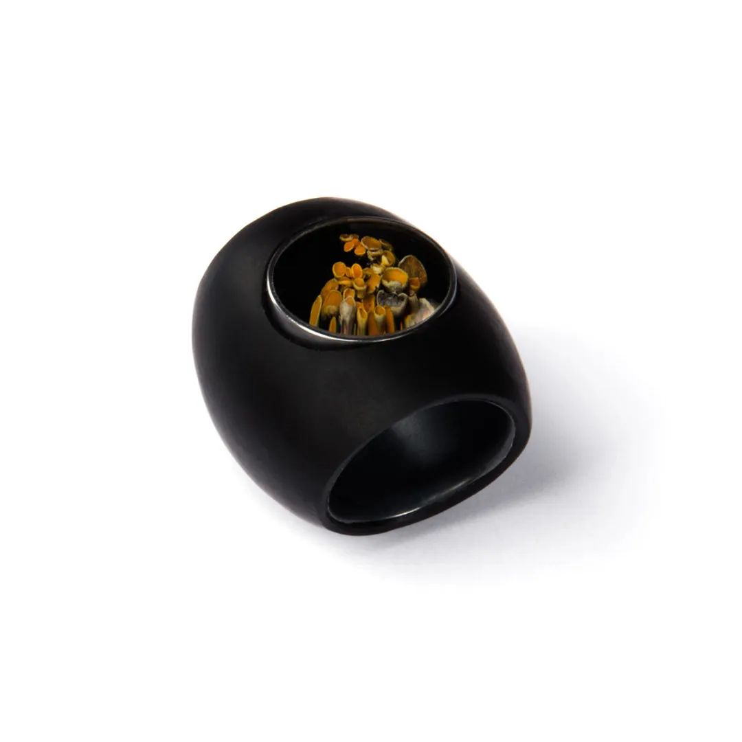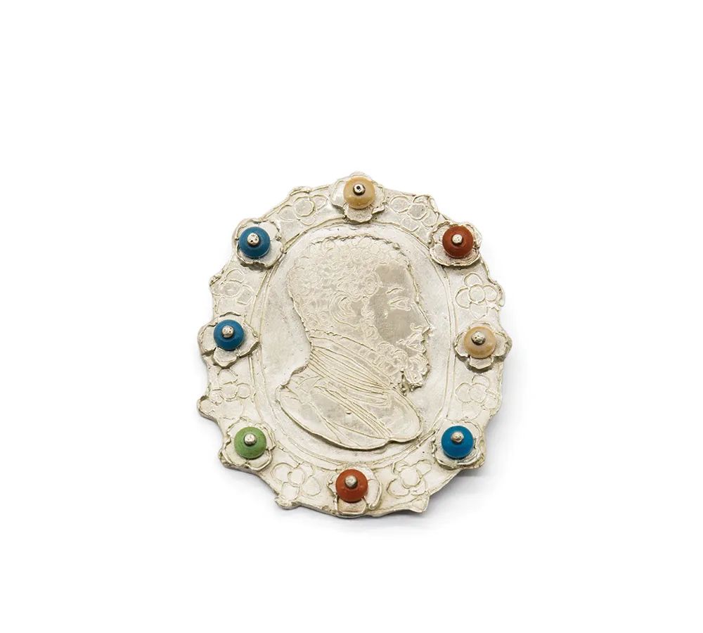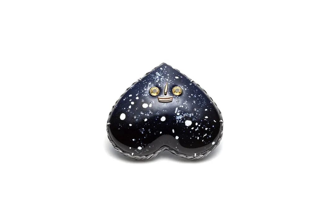 與傳統珠寶作品中寶石與構成結構支撐的貴金屬相輔相成不同,這些作品中,寶石以薄片的形式被分層重疊,形成對比鮮明的不透明部分,然后使用彩色樹脂將它們連接在一起,制作成為整個胸針。