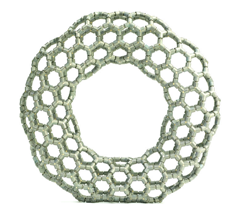 作品整體以完美的幾何形態(tài)呈現(xiàn),弧面金屬的光澤創(chuàng)造出一種透明空間的錯覺,表面點綴的金銀粒與寶石則象征著遠處的星塵。這種像甜甜圈一樣的造型吻合近年來科學家們對宇宙形狀的推測(這個形狀在?sa Christensson的作品中也多次出現(xiàn)。)