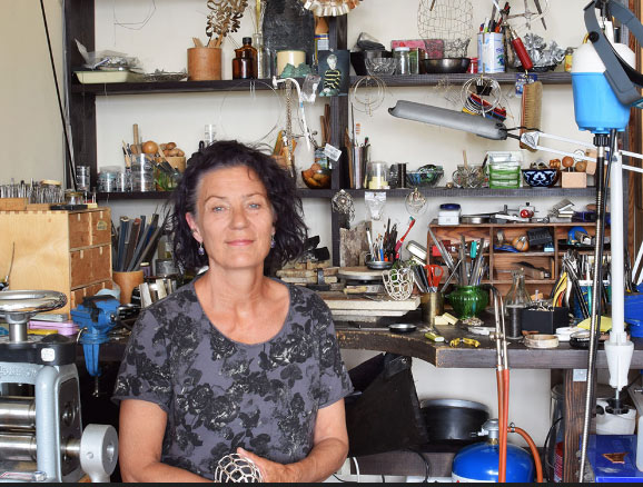 Julie Blyfield已經實踐了 30 多年,目前在她自己的獨立工作室里,俯瞰著她在南澳大利亞梅蘭茲的花園環境。Blyfield 的首飾和實物作品的靈感來自對植物標本、歷史銀器收藏和澳大利亞豐富多樣的景觀的研究,她使用金屬追逐、錘擊和表面鑿刻技術來解釋這些,主要是純銀和最近的銅。
