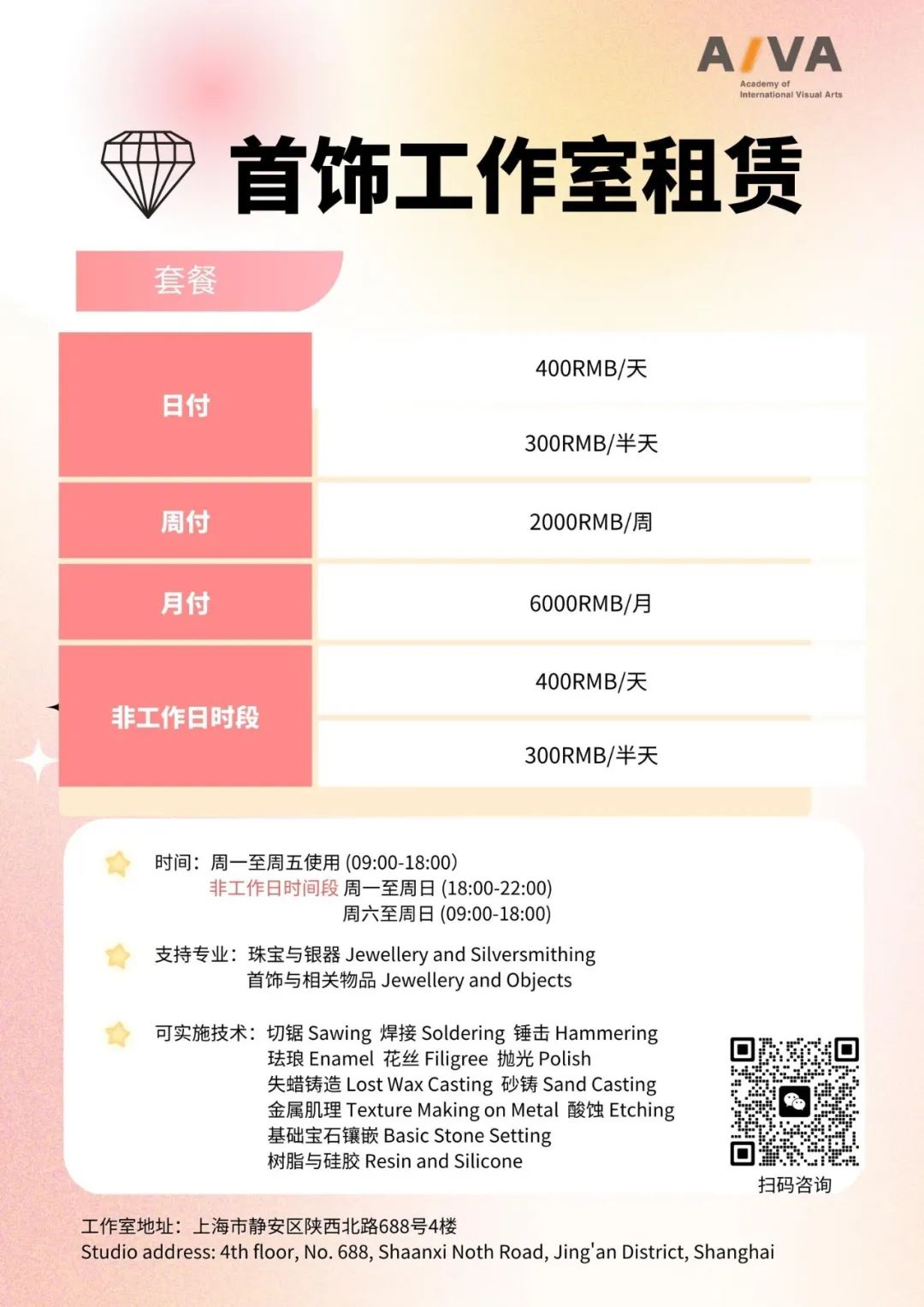 2. AIVA往屆學生可享7折優惠使用工作室(包含往屆預科、藝術作品集、背景提升課程、首飾設計1v1課程學生)。