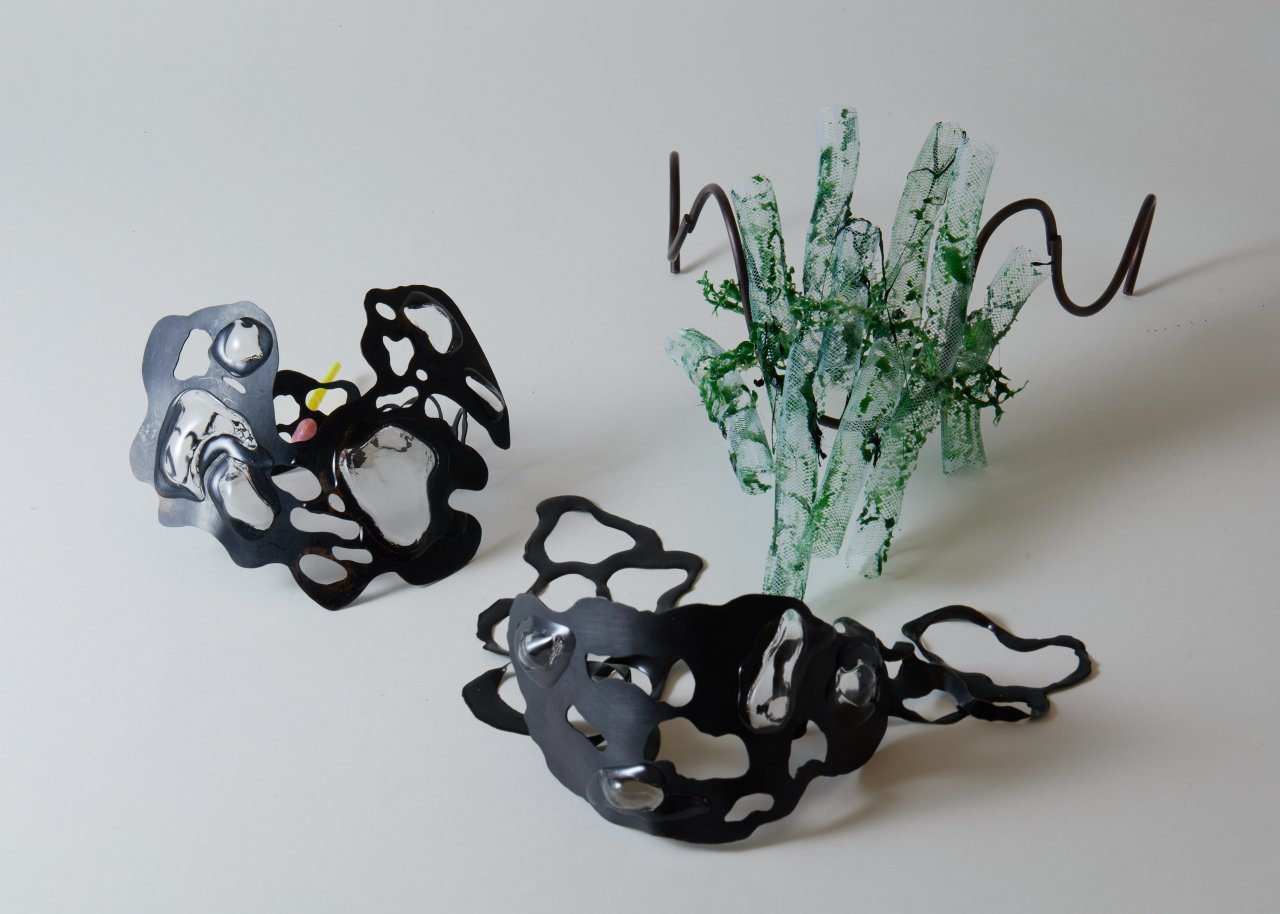 在作品《窒息感》中,以海牛因為海藻的泛濫而缺氧為靈感,我嘗試加入了有關海藻本身的材料去融入作品,比如海藻酸鈉。作品都是圍繞著面部去展開。因為環(huán)境和海洋的污染本質(zhì)上人為因素占比更多,所以我想讓佩戴者感同身受海牛的處境。作品利用泡泡膠這一材料,結(jié)合封固在人面部的網(wǎng)狀框架,讓人們從視覺感受到想呼吸卻被外面的框架給阻擋住的痛苦。將金屬氧化成黑色,既想從視覺上讓佩戴者感受到缺氧帶來的痛苦,并且能突出海洋生物在海洋中的絕望。