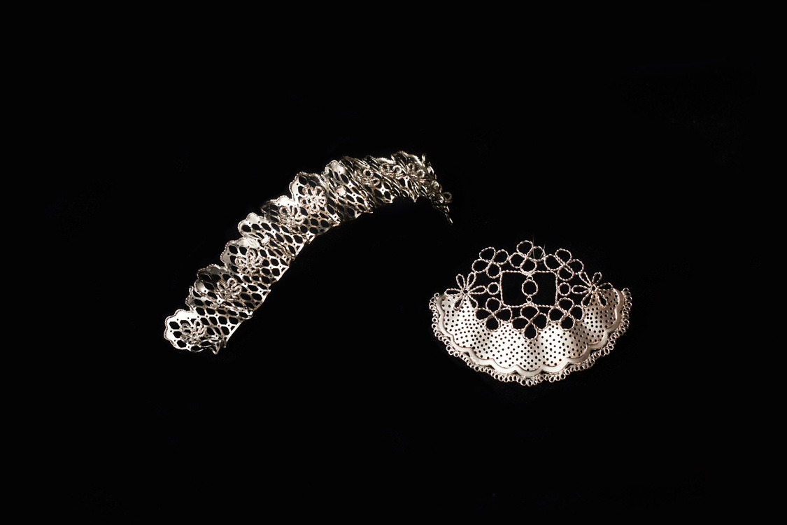 《Laced Armor》這個(gè)項(xiàng)目靈感來(lái)源我將洛麗塔裙作為日常服飾穿著的經(jīng)歷。如今許多人認(rèn)為穿著洛麗塔服飾是一種“媚男”的表現(xiàn),因?yàn)樵S多洛麗塔模特都呈現(xiàn)白幼瘦的外貌。但在我看來(lái),洛麗塔是女性以極度夸張的形式表達(dá)自己女性特質(zhì)的一種方式。它幫助我表達(dá)自己的個(gè)性,并成為了屬于我自己的柔軟鎧甲。蕾絲是洛麗塔服飾中不可或缺的元素,因此我將其作為作品的主題。蕾絲通常被認(rèn)為是柔弱易碎的,但我希望我的作品能表現(xiàn)出我和所有熱愛(ài)洛麗塔風(fēng)格的女性的堅(jiān)韌和頑強(qiáng)。因此,我決定用金屬重新表現(xiàn)衣服上的蕾絲,盡可能保留蕾絲的圖案和紋理,以營(yíng)造出對(duì)比的效果。