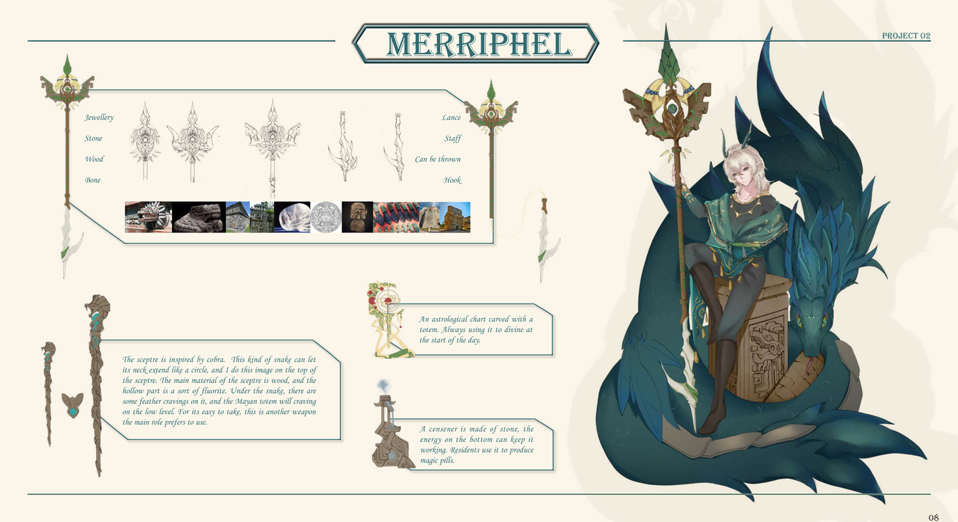 In my work Merriphel, I chose the Maya culture as the background for character design. However, I also combined elements from the Aztec culture, the sister culture of the Maya, into the related backstory. The Maya and Aztec cultures have many similar yet distinct features, which which provides a rich foundation for creative design. In this project, I designed props and items made of materials commonly used in Maya rituals, such as stone, wood, and bone, for each non-player character (NPC).