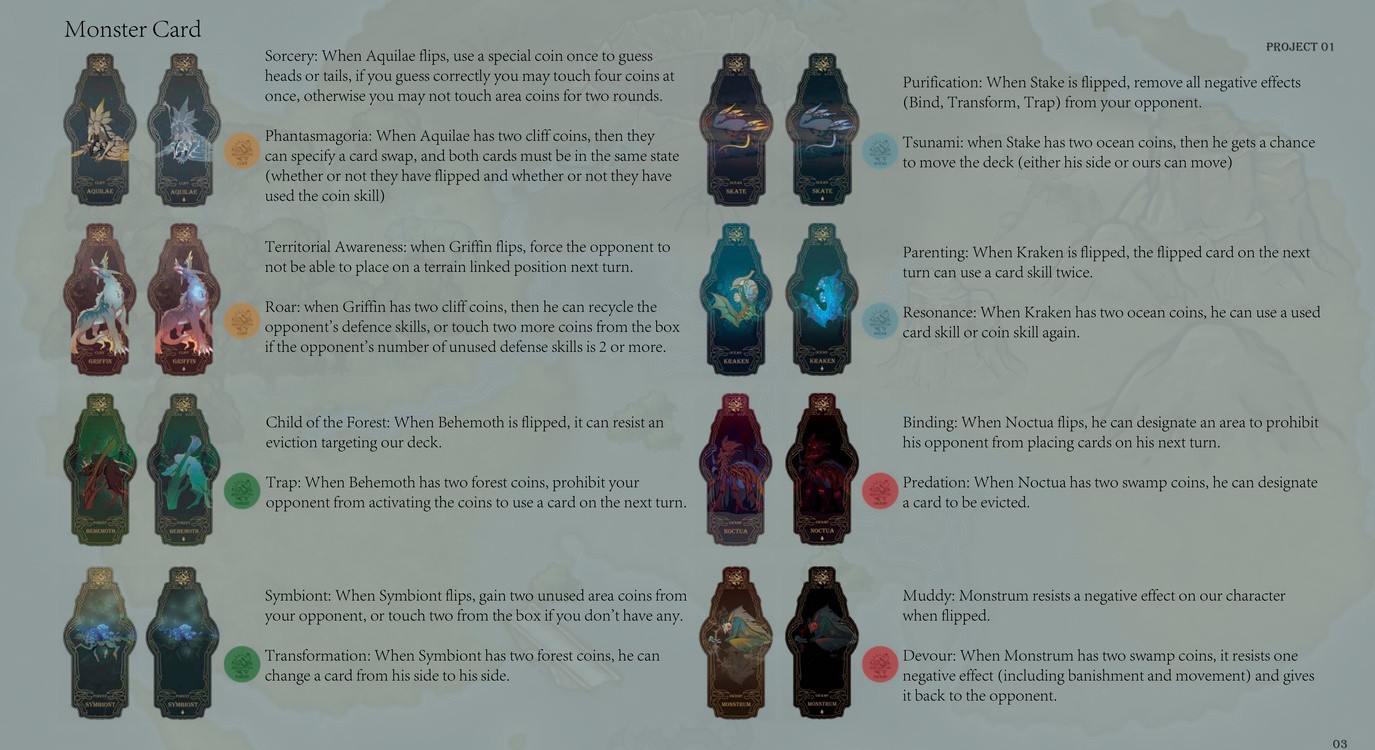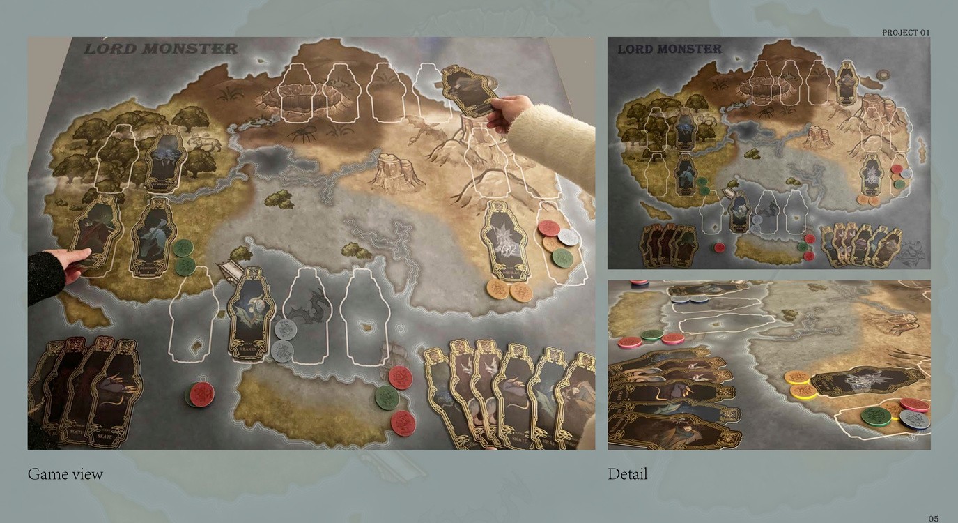 In another card game design project Lord Monster, my inspiration comes from a mishmash of myths and legends. These include Japanese folklore, the ancient Chinese geographical work The Classic of Mountains and Seas, and the monstrous creatures of Norse mythology. I’m passionate about combining elements of completely different creatures and designing their habits and habitats with unique story backgrounds. Many conceptual artists have already explored various designs in the past, so creating an independent world with new creatures presents an exciting challenge for me. Furthermore, I designed different characteristics and play styles for the front and back of each card, allowing players to learn more about the creature’s habits and story through gameplay. Additionally, I designed the maps to have gameplay that can trigger regional interactions with the cards, providing a more immersive experience for players who are interested.