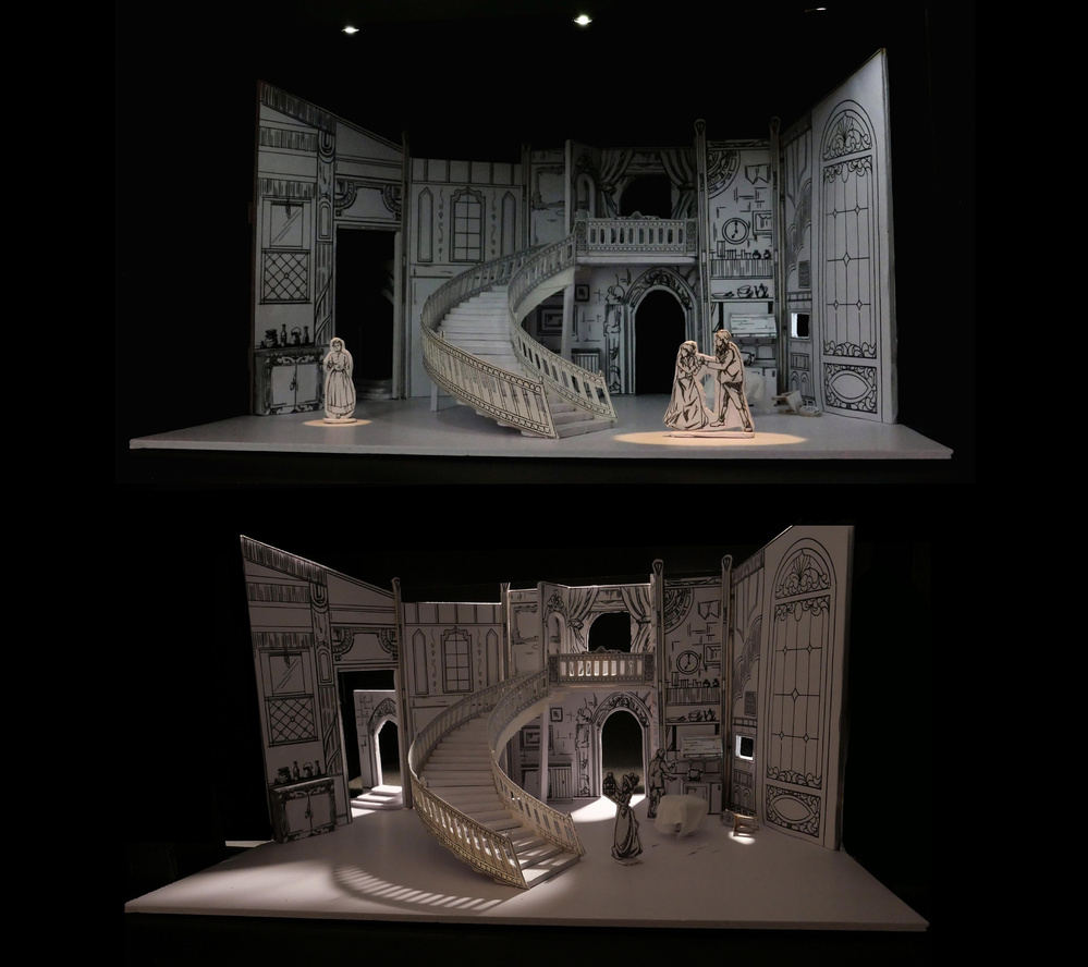 《當你老了》這個項目讓我能夠制作不同的場景來展示愛情在各個階段的進展:相遇、求婚和老年。 盡管我發現這個項目對我來說具有挑戰性,但它使我加深了對敘事詩意意象的理解。除了為古典文學設計舞臺之外,我還為《愛麗絲夢游仙境》設計了一個非傳統的舞臺,融入了鮮艷的色彩和鏡子等元素,讓觀眾沉浸在愛麗絲的魔法世界中。此外,在描繪19世紀女性悲劇《朱莉小姐》的過程中,我加強了塑造白模的技能。通過對細節的審視,文本與模型的區分成為一種旨在對比社會地位的雙層建筑設計,最終象征著主人公的困境。我的目標是通過打造這個經典舞臺來強調女性角色的力量和獨立