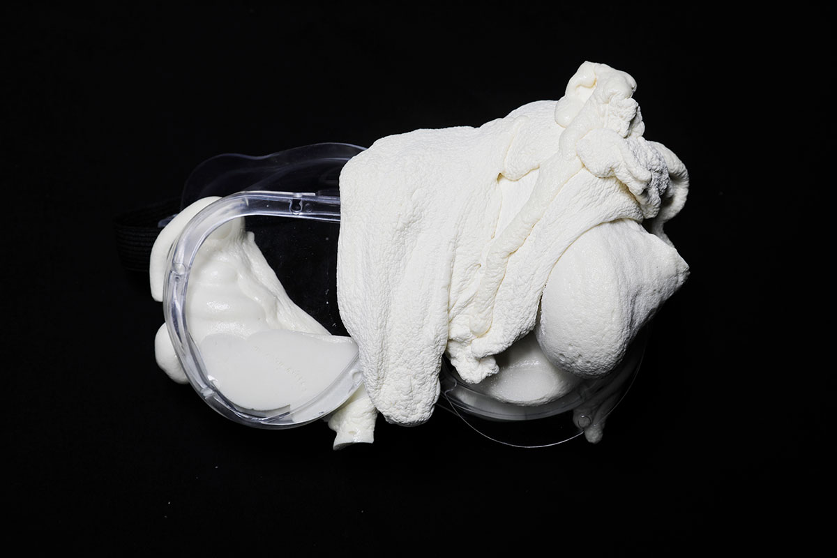 My art practice is using visual language to discuss some social phenomenon or to explore what jewellery is in contemporary context. For example, in my recent work The Price, I discuss an abnormal and uncontrolled phenomenon to the increase in price of the epidemic prevention products. I protrude the violence premium prominently with an exaggerated artistic technique. The material is based on the same view by using virus of low density and expandable foam; by dyeing, expanding, shaping and solidifying, I combine the foam and the prevention products together to receive the expected visual effect.