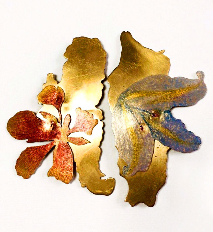 I try to break the tradition of only using metal as the material to make jewellery. There is an adventure of materials behind each piece of jewellery. Exploring the possibility of different materials can bring the spark of collision. For example, in the series of <Human cell>, I use resin as the main material and mix it with propylene, colouring agent, cold enamel and liquid resin to create a fantastic visual effect. In my artwork <Maps>, I use colour pencil to colour the copper plate, which enhances the richness of the colour and the beauty of the picture.