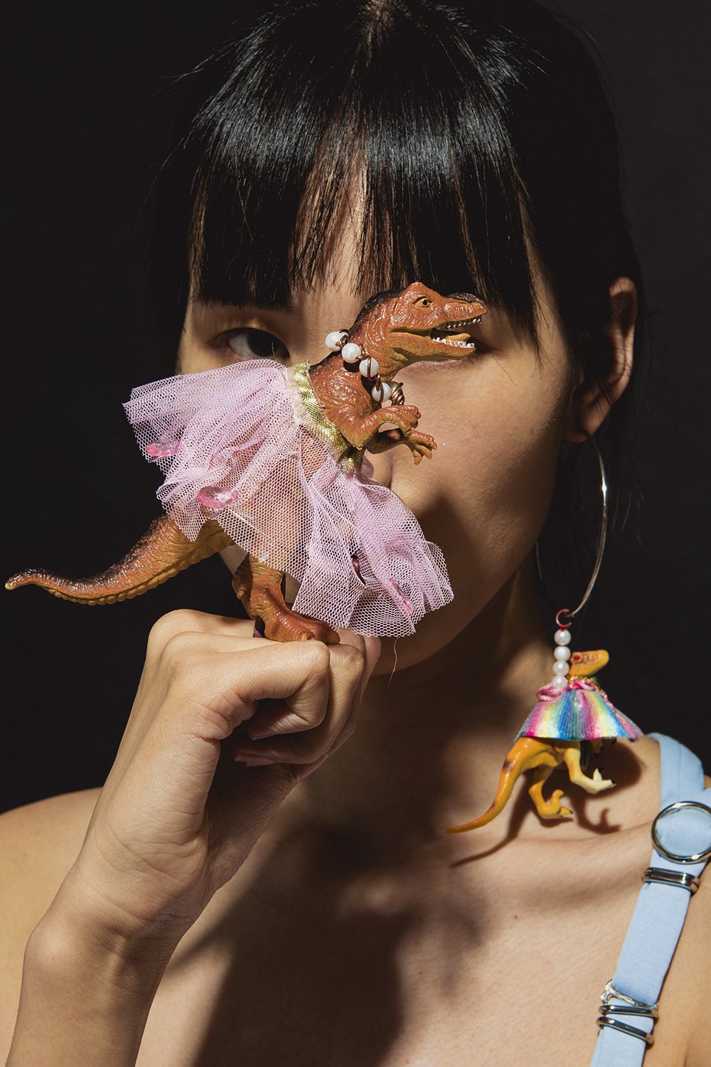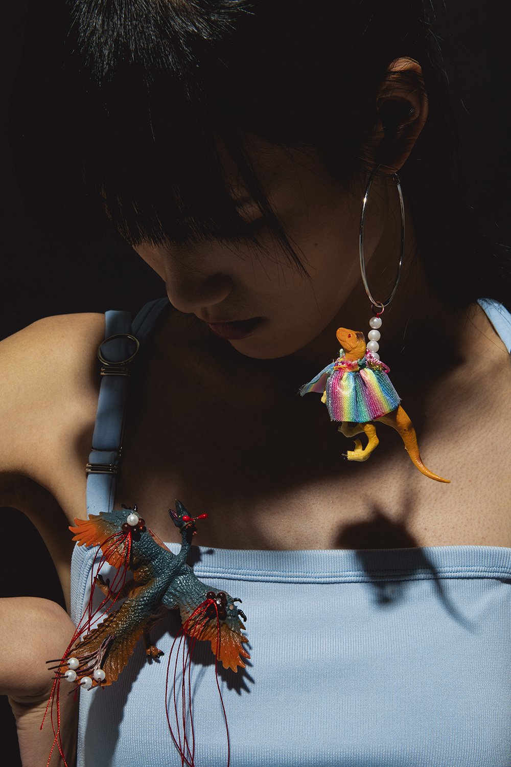 孩子的性別認知基本來自于長輩的引導以及身邊事物的影響,不同的認知過程都可能造成孩子們不同的性別差異。我的第二個作品《Dinosaur in a Skirt》講述了自己的故事,恐龍是我從小最喜歡的玩具,但在大人眼里身為女孩的我應該玩女孩子該玩的玩具,比如娃娃。這一系列首飾通過玩具恐龍穿女性服飾和佩戴珍珠元素的飾品來討論社會對兒童的性別刻板印象,同時引發(fā)觀者對兩性平等的思考。